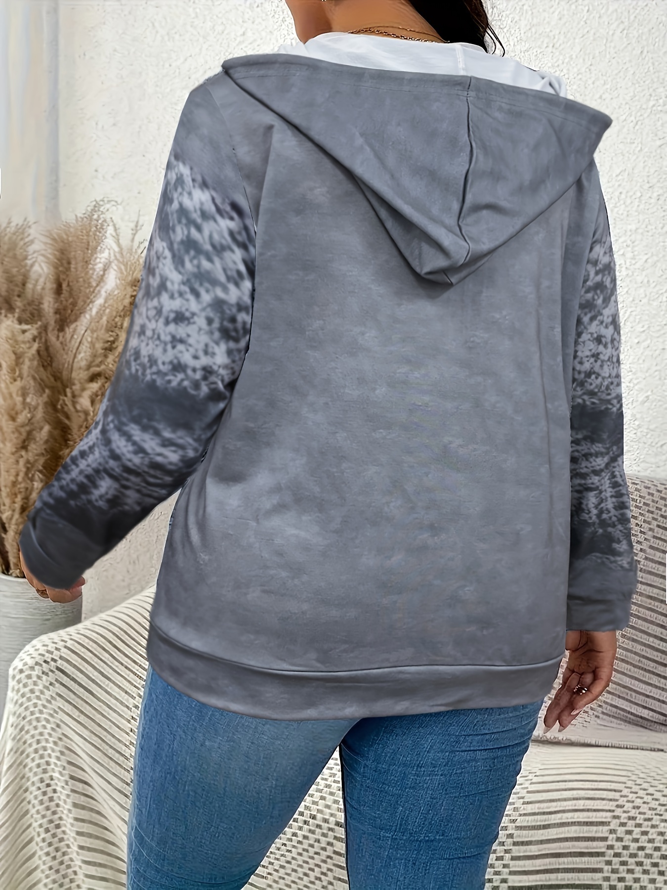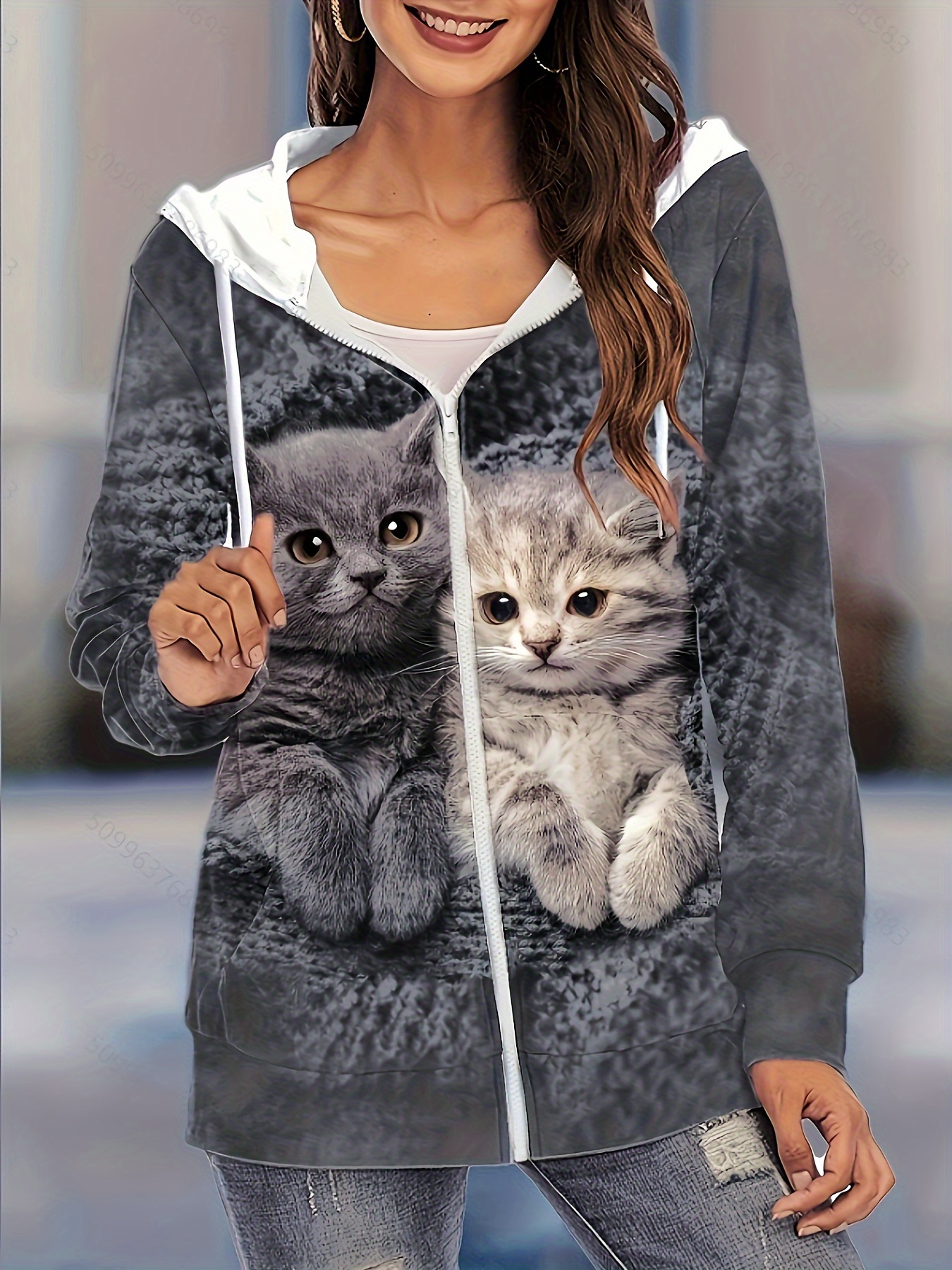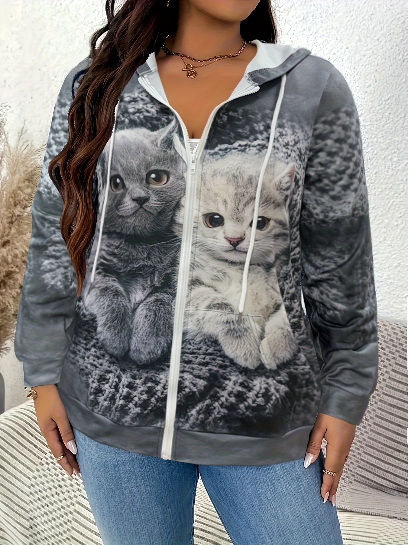 Chic Plus Size Cat Print Hooded Jacket with Pockets - Zip-Up, Long Sleeve, Polyester Blend - Elegant Women's Outerwear