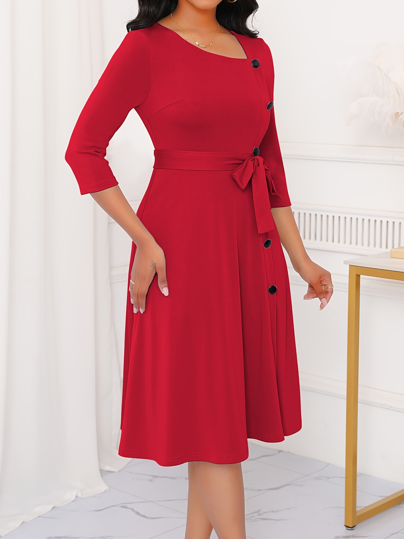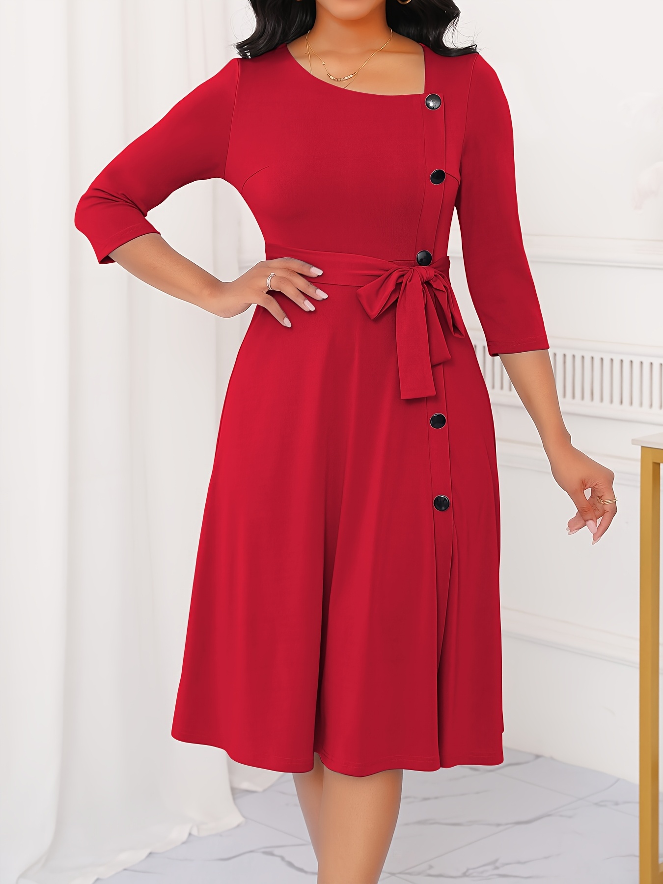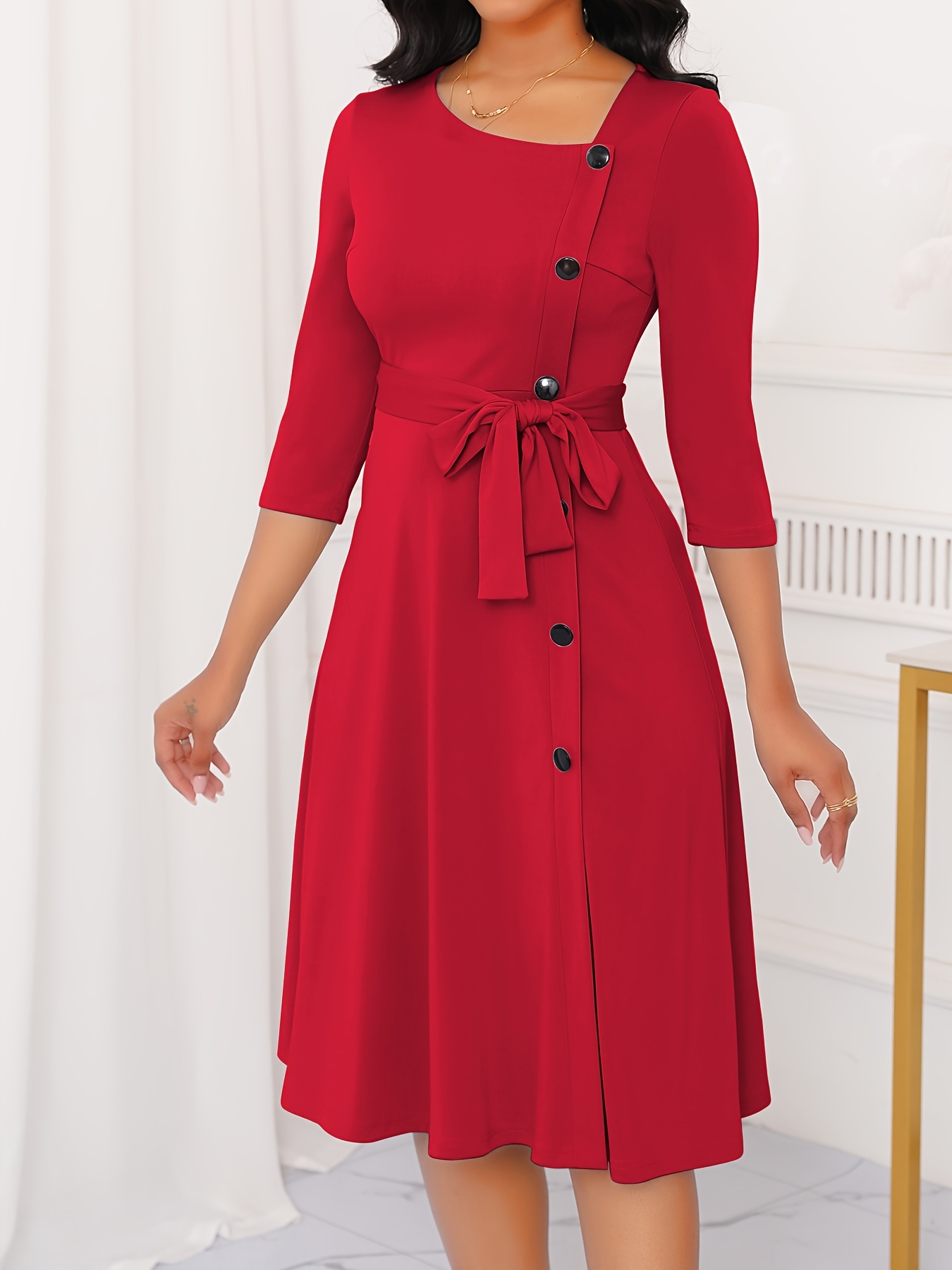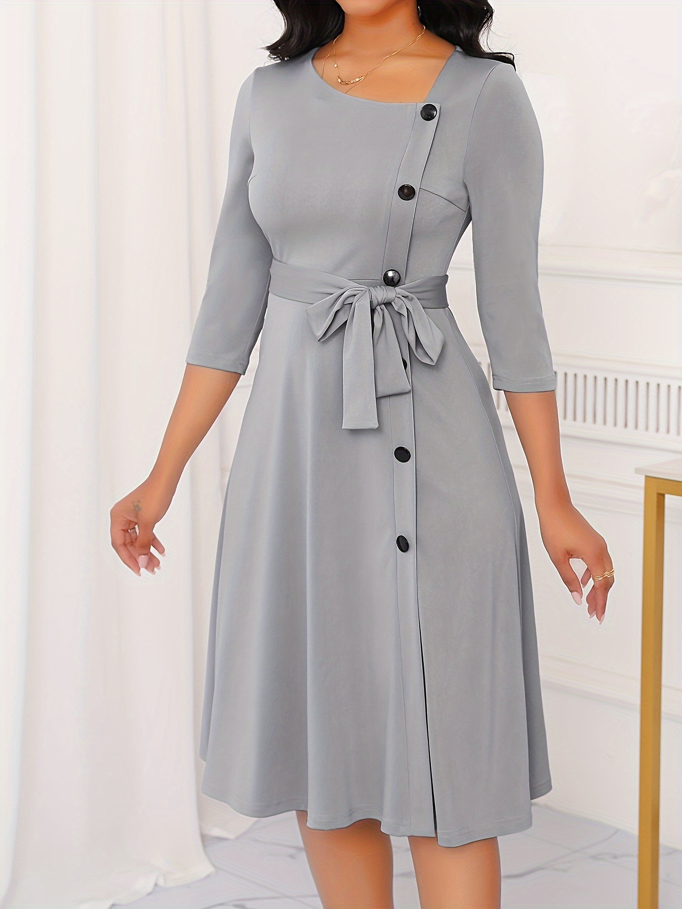 Elegant Slim Fit Solid Color Midi Dress with Waist Tie and Button Front - Chic Flared Silhouette, Long Sleeves, and Belted Waistband for a Sophisticated Look, A-Neck Style, Perfect for All Seasons, Stylish Women'S Dress, Perfect for Parties and Events