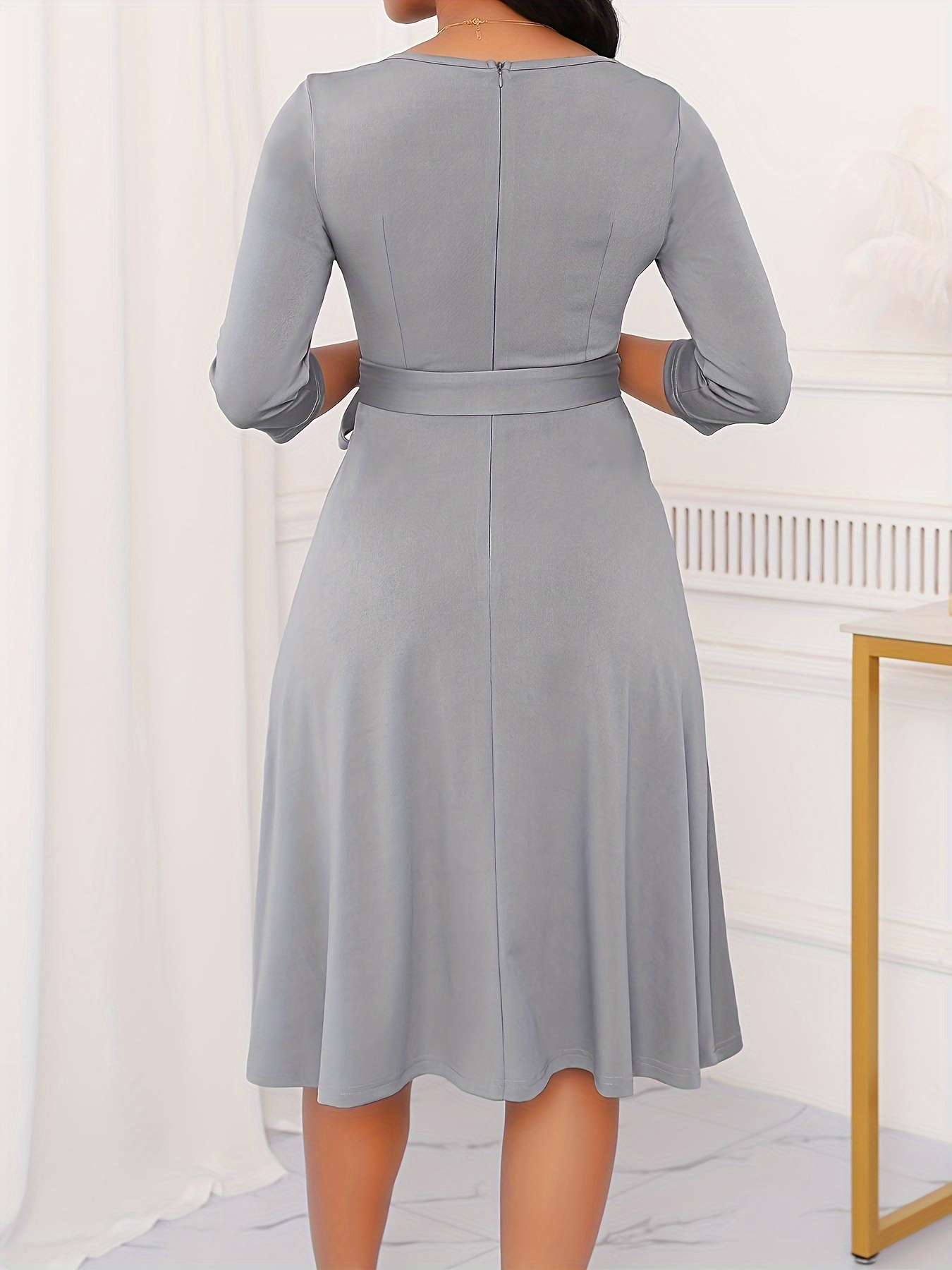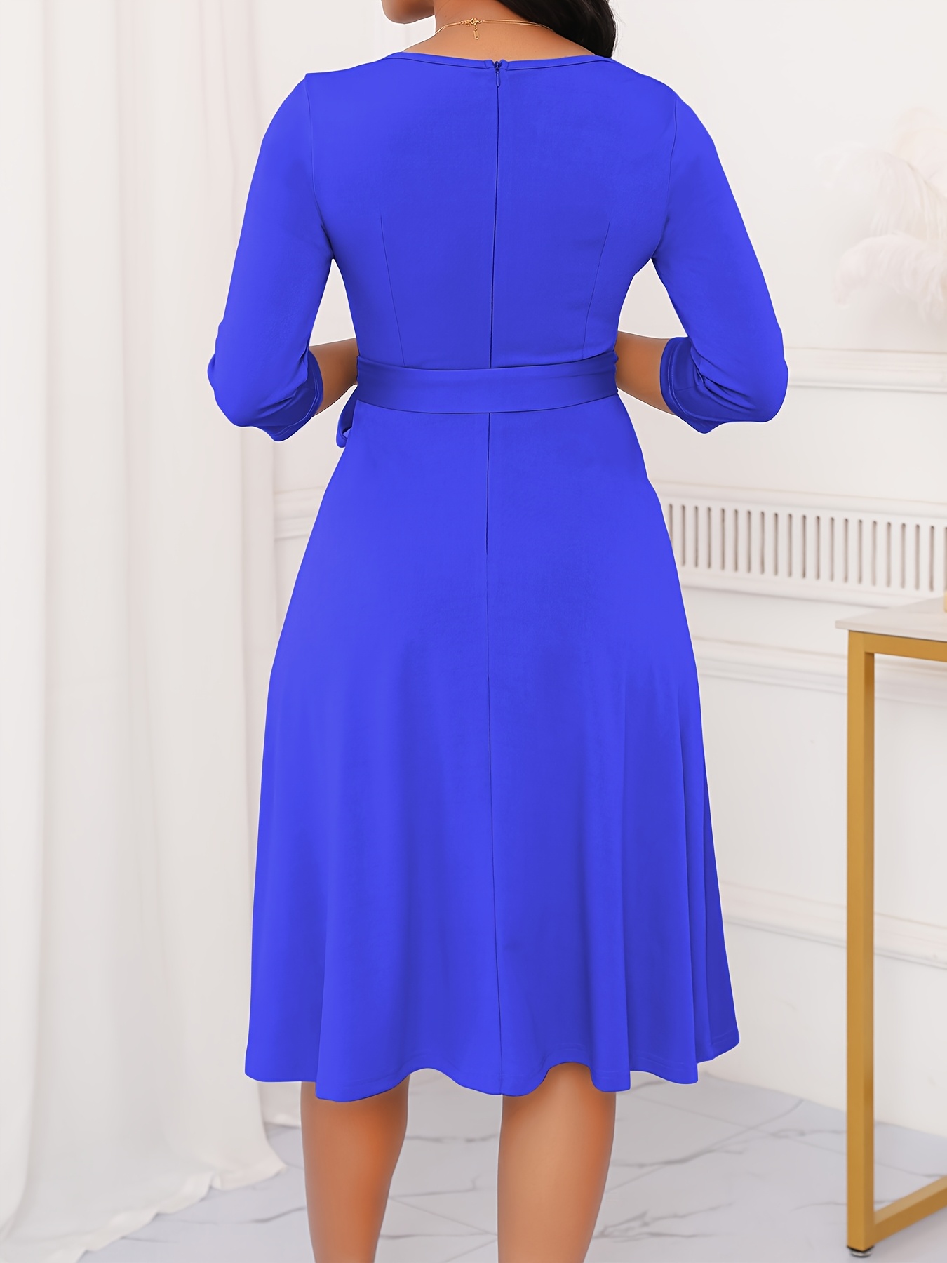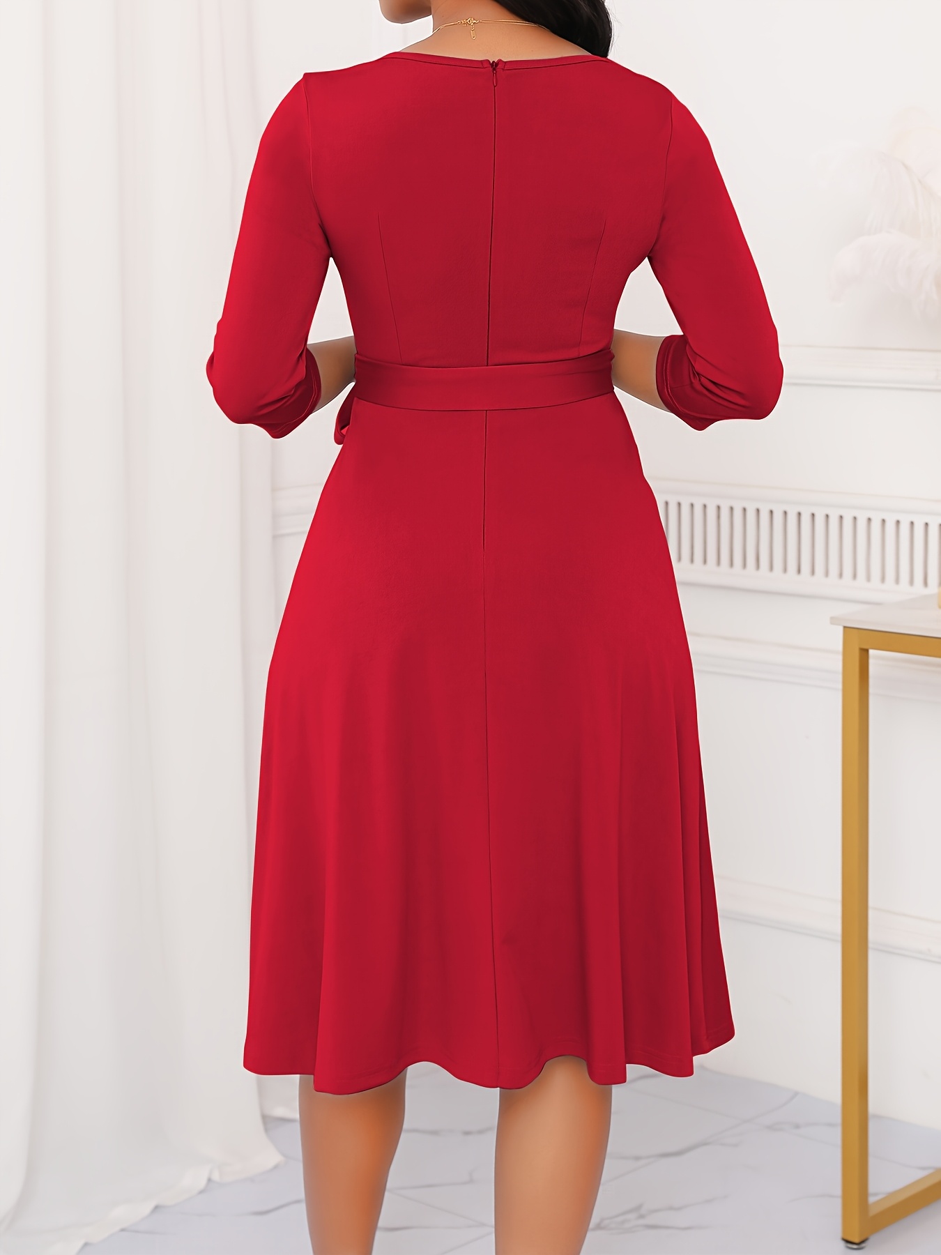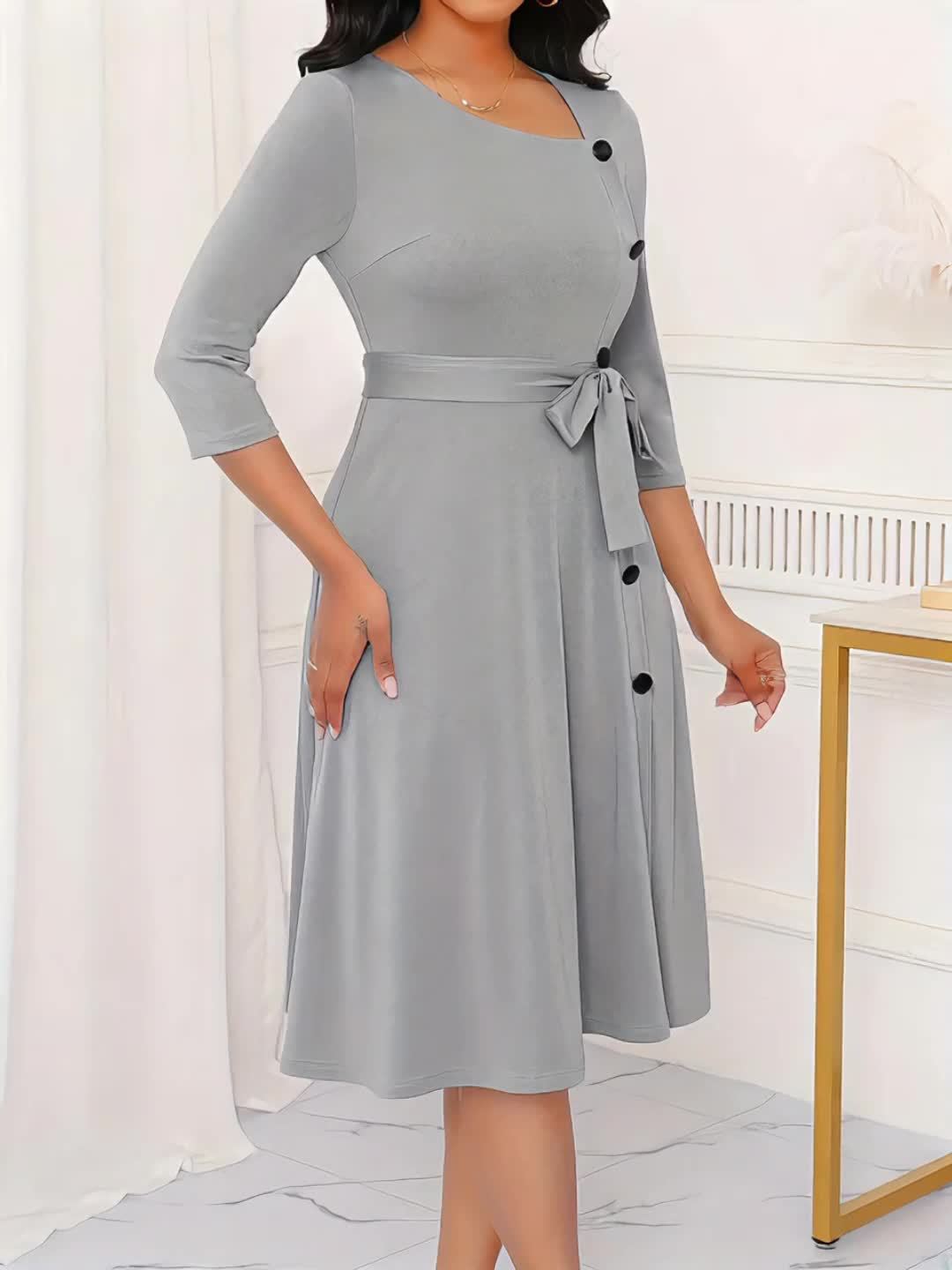 Elegant Slim Fit Solid Color Midi Dress with Waist Tie and Button Front - Chic Flared Silhouette, Long Sleeves, and Belted Waistband for a Sophisticated Look, A-Neck Style, Perfect for All Seasons, Stylish Women'S Dress, Perfect for Parties and Events