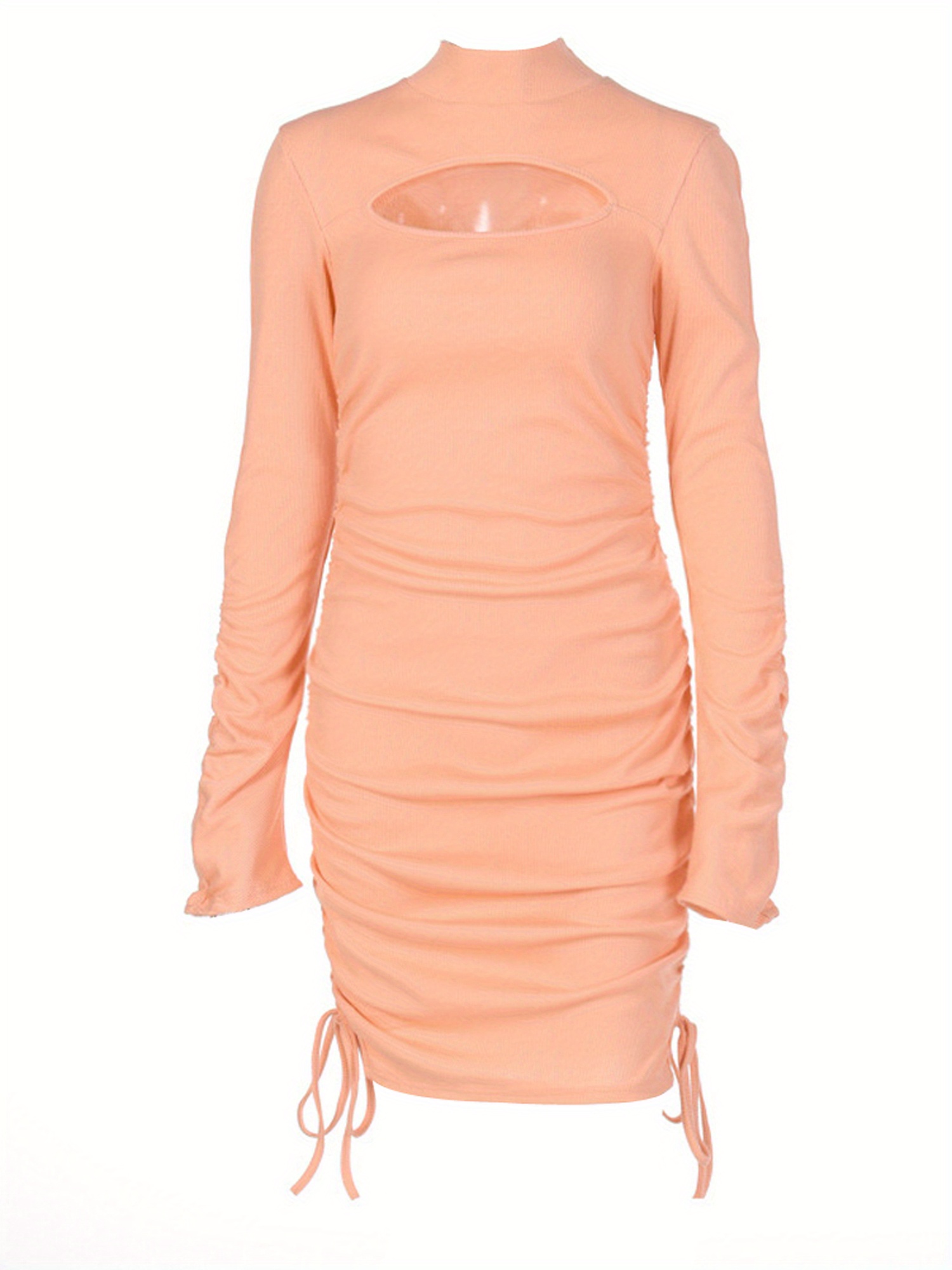 Women'S High Neck Long Sleeve Bodycon Mini Dress with Front Cutout and Side Ruching Drawstrings, Solid Color Soft Cotton Blend, Versatile & Seasonless
