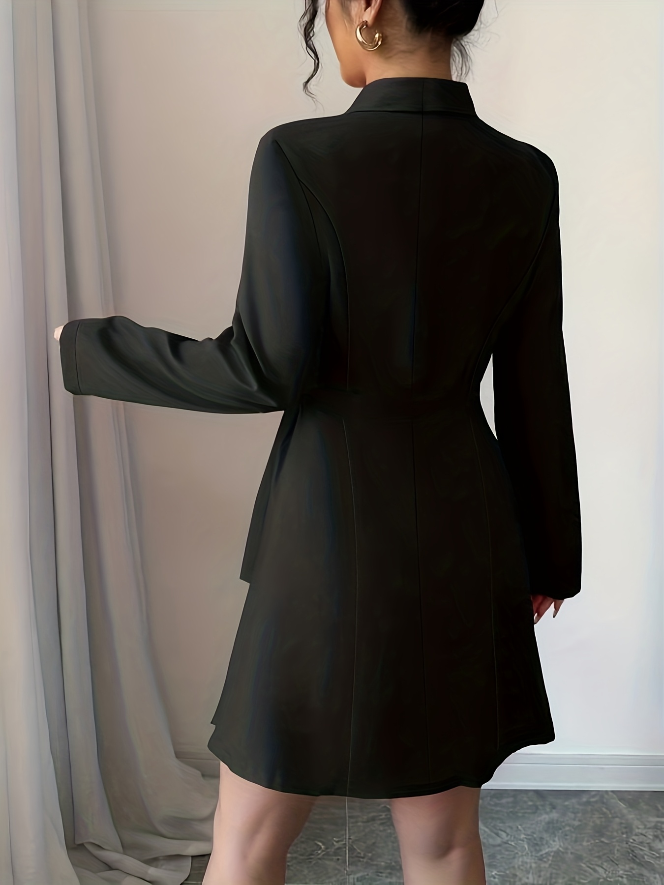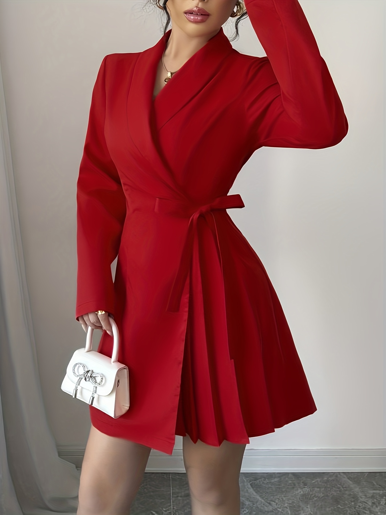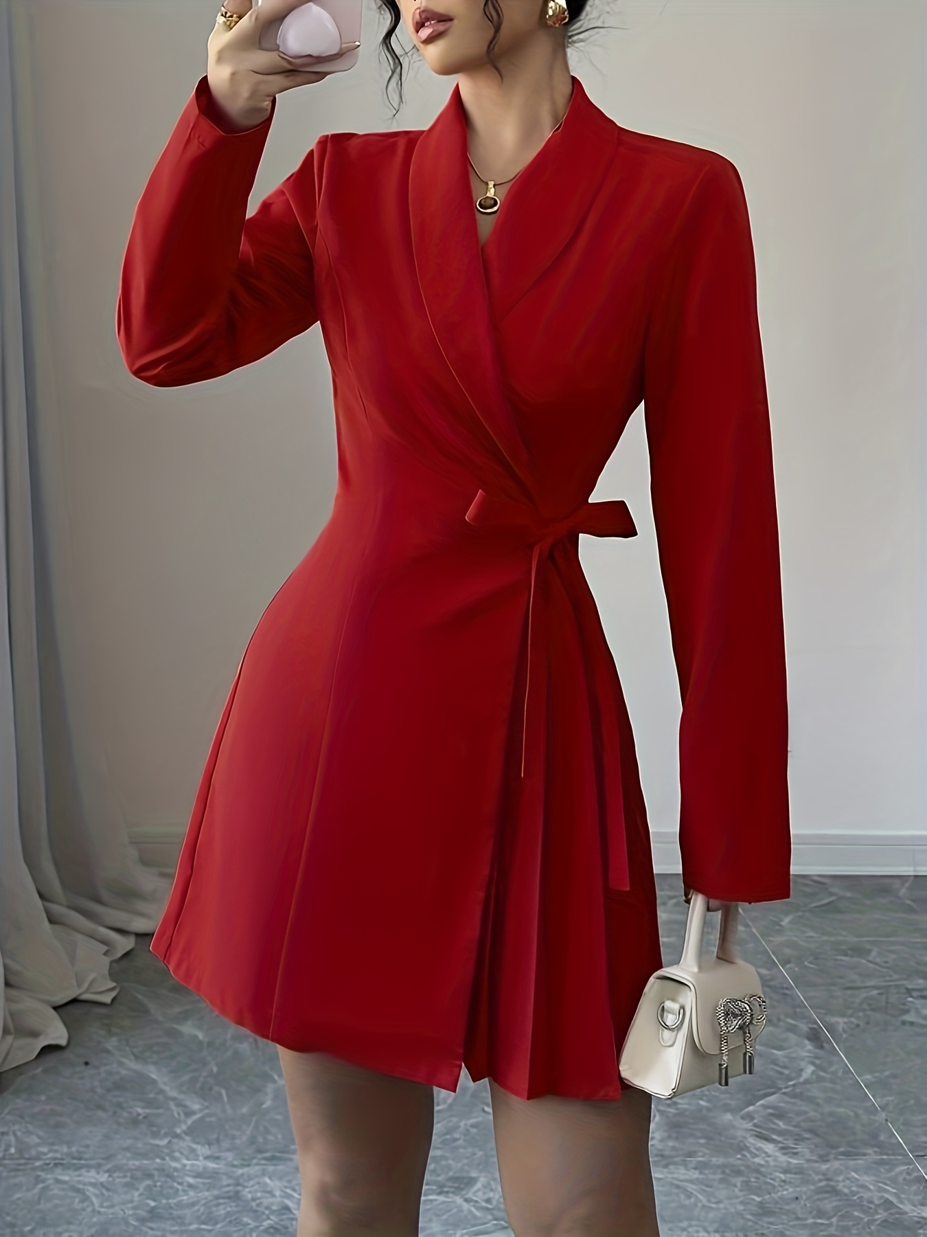 Elegant Lapel Long Sleeve Dress with Bow Tie and Pleats | Mid-Length, Solid Color, Fitted, Perfect for Spring/Fall, Commute and Party Essentials