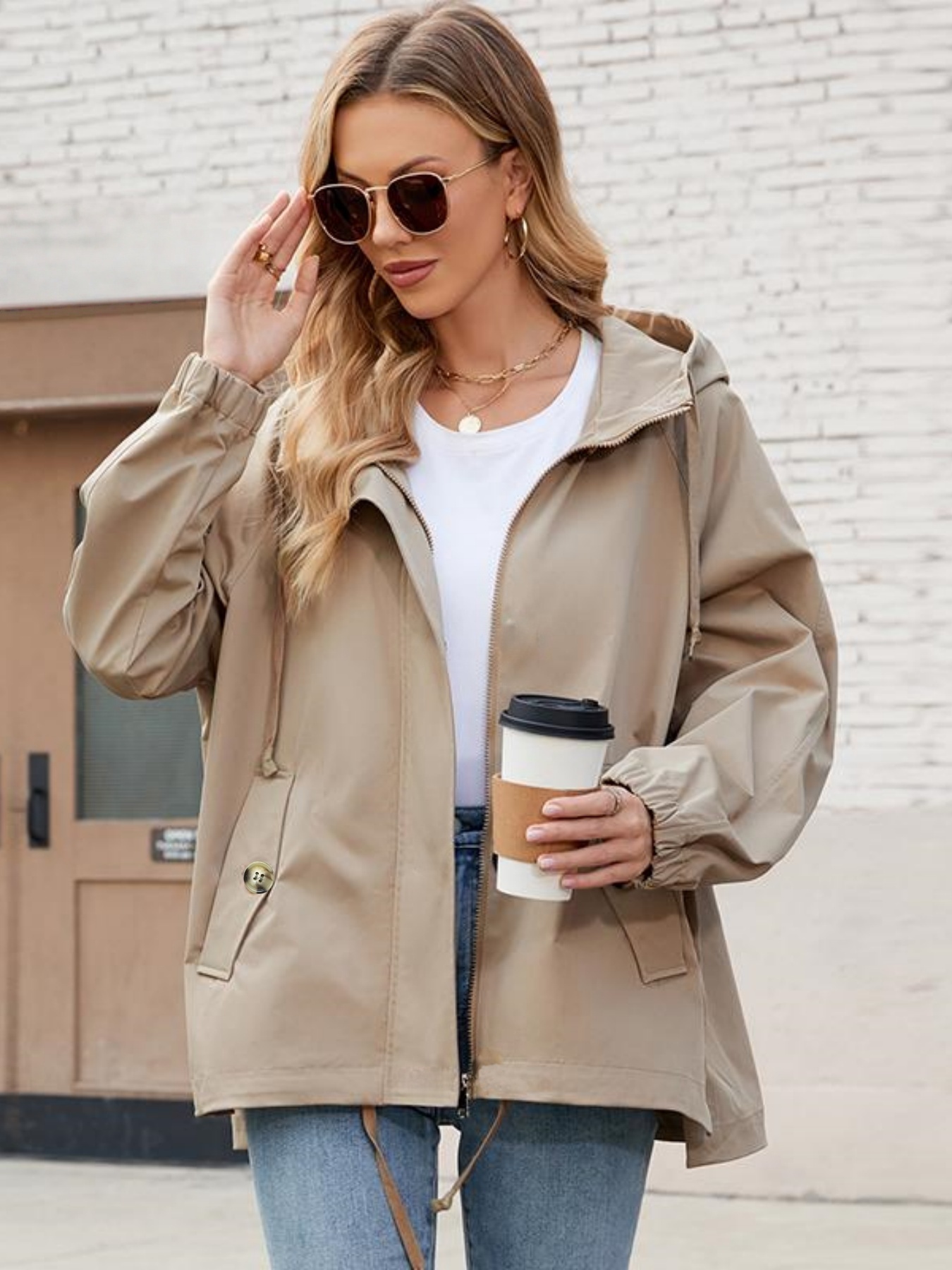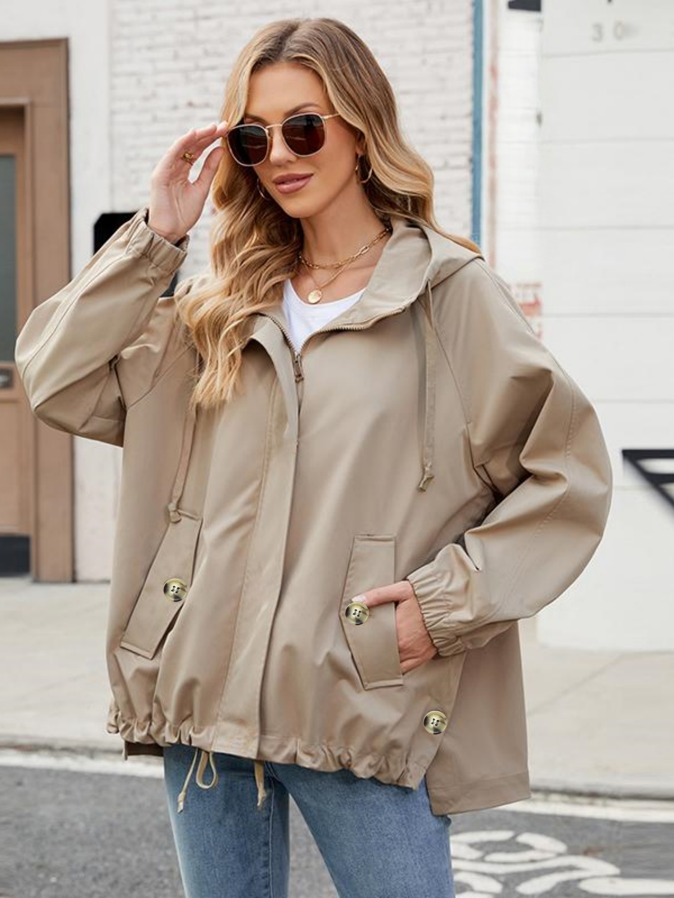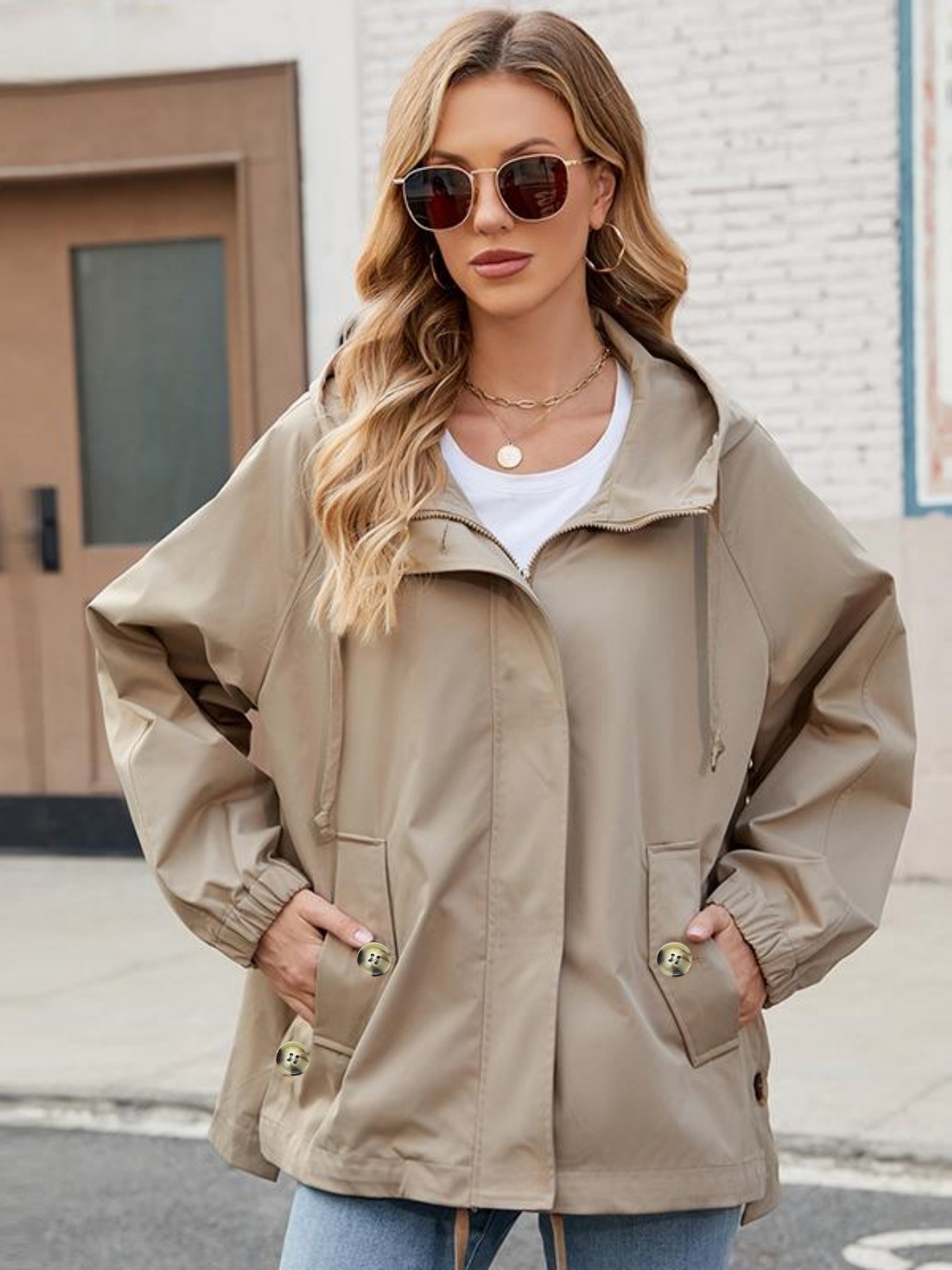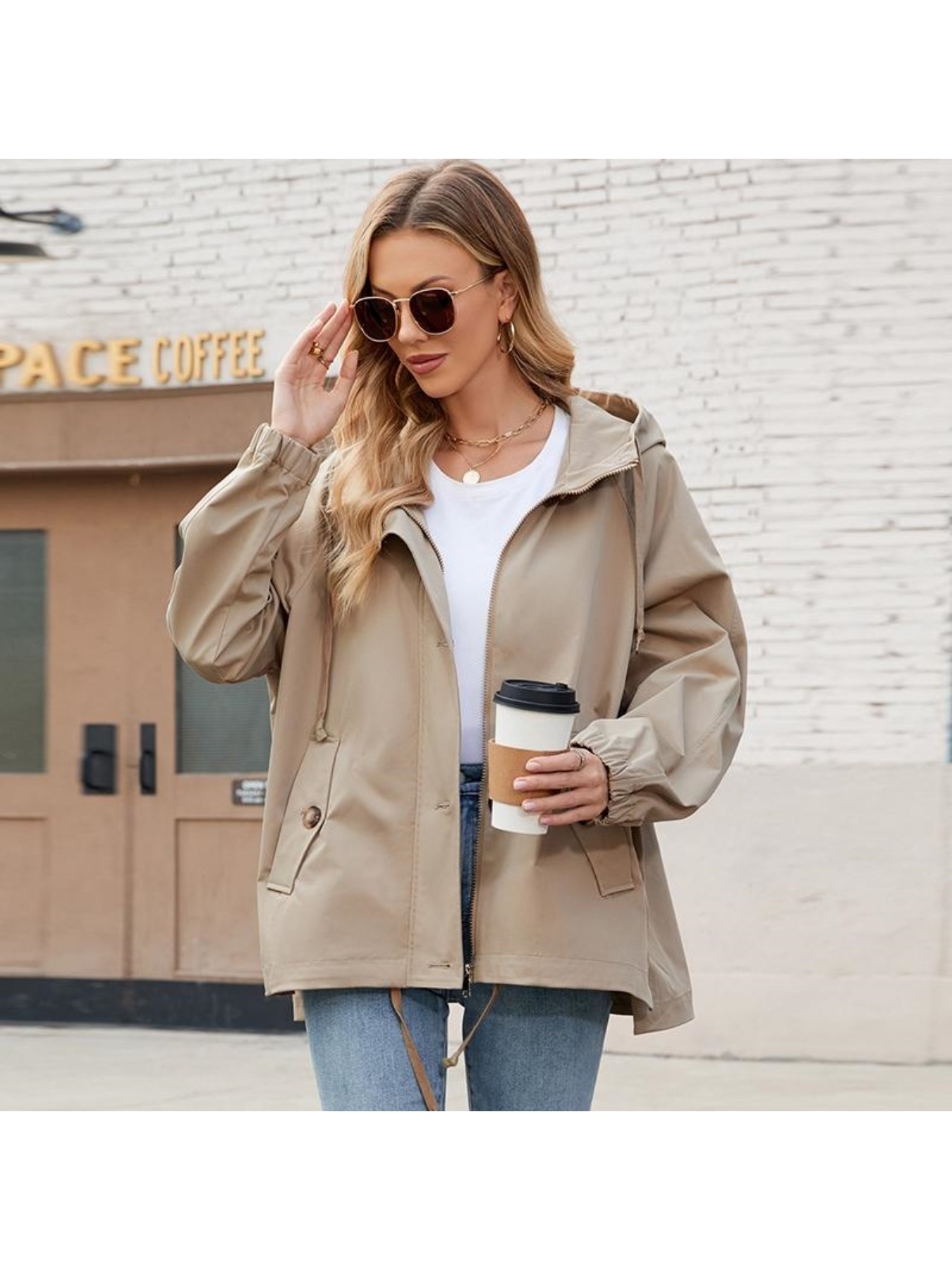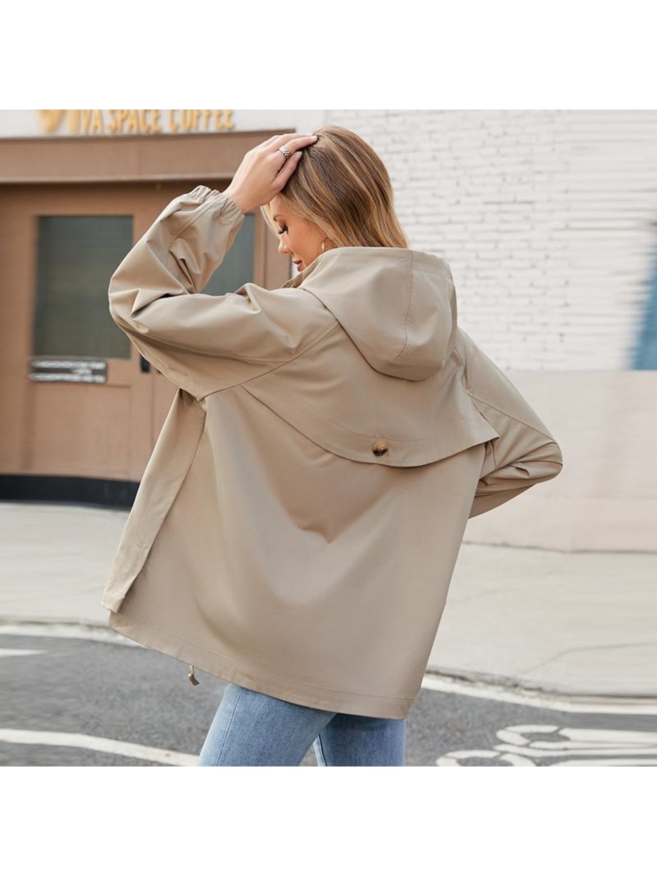 Plus Size - Plus Size Women'S Elegant Hooded Trench Coat - Loose-Fit Windproof Jacket with Double Zipper Closure, Long Sleeves & Belted Waist - /Neutral Tones - Spring/Fall