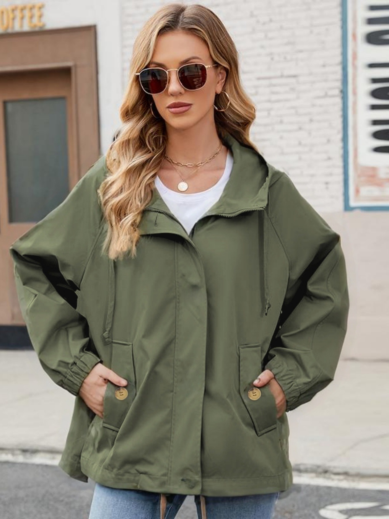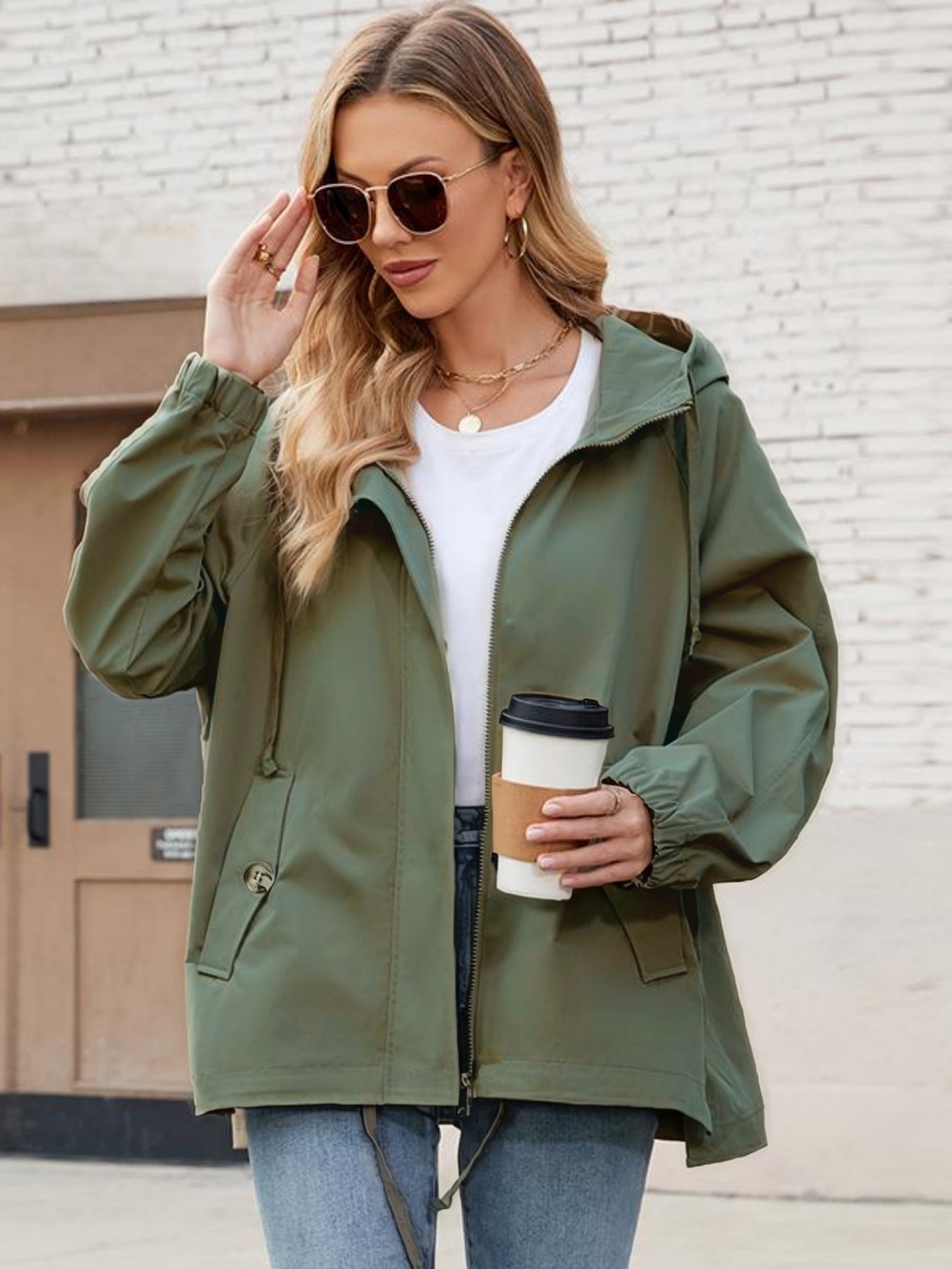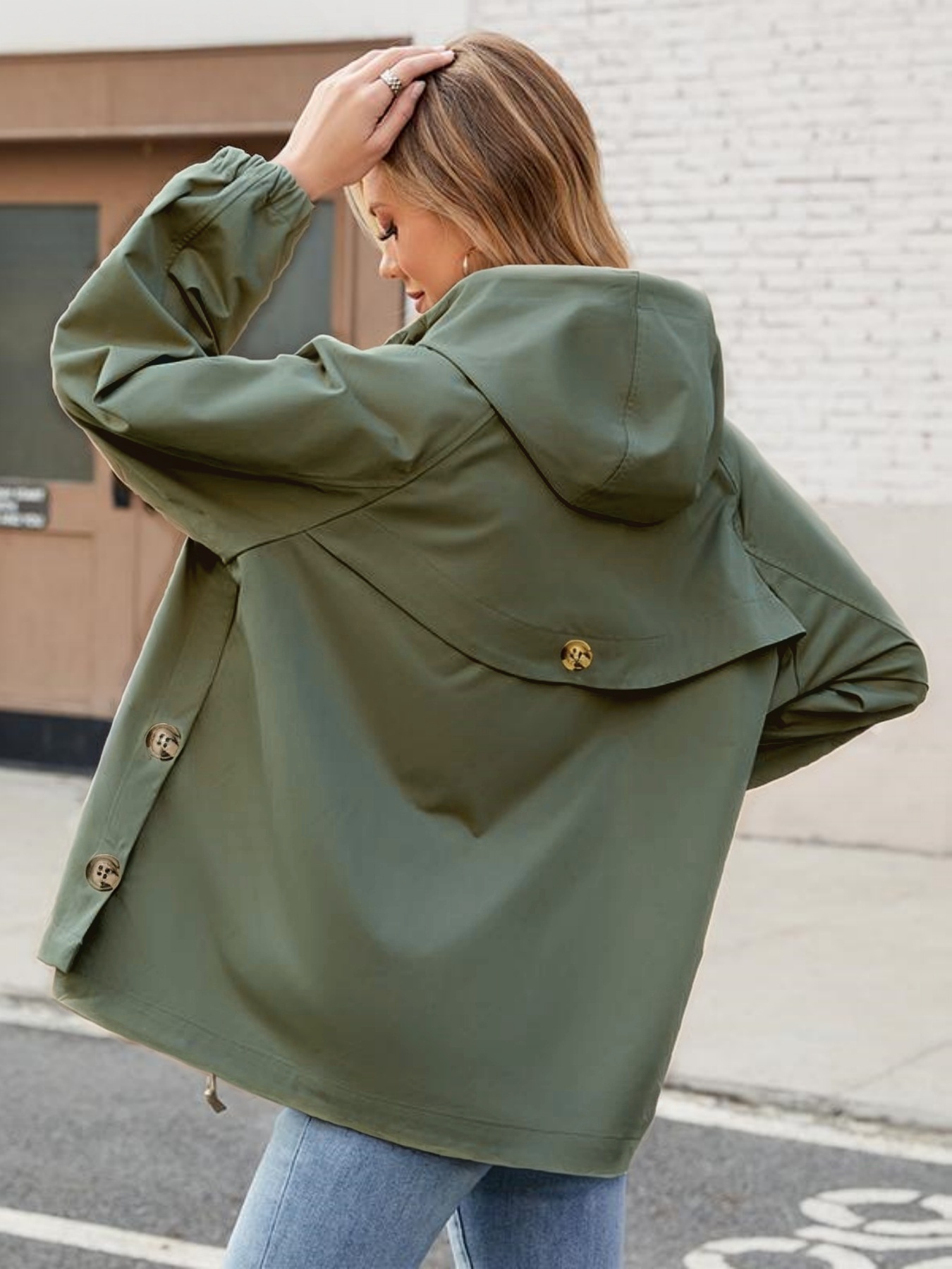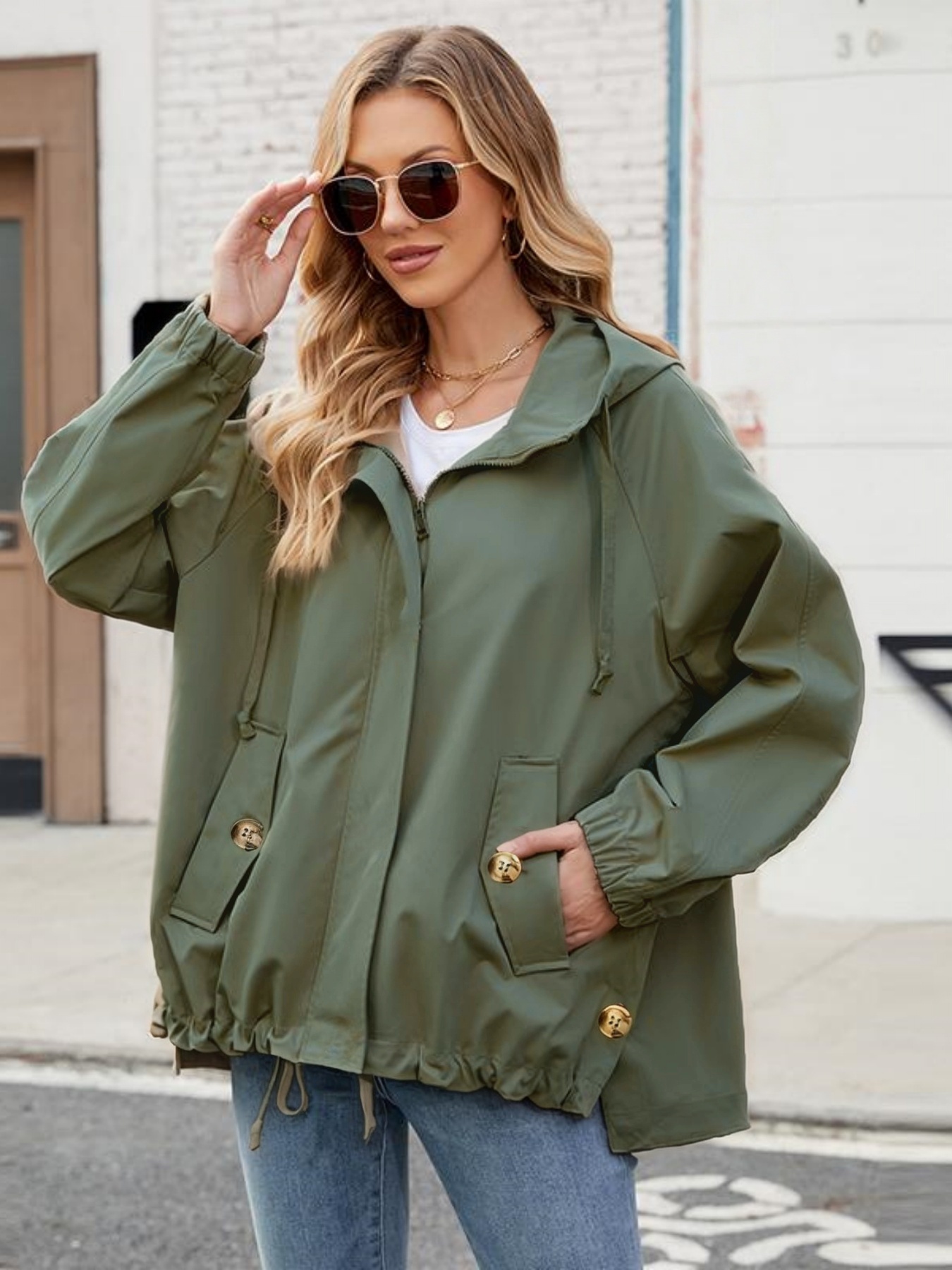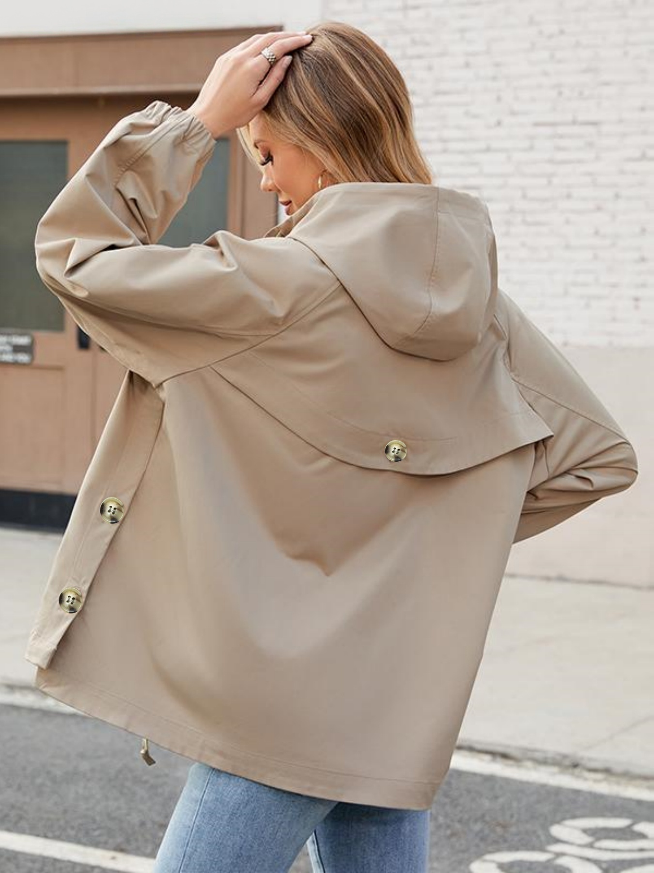 Plus Size - Plus Size Women'S Elegant Hooded Trench Coat - Loose-Fit Windproof Jacket with Double Zipper Closure, Long Sleeves & Belted Waist - /Neutral Tones - Spring/Fall
