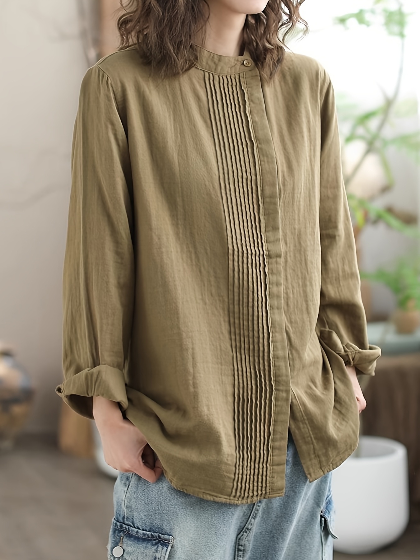 Plus Size - Women'S Casual Loose Fit Side Stand Collar Pleated Blouse - Solid Color Button-Up Shirt with Ribbed Texture, Long Sleeves, and Button Details for All-Season Wear, Versatile Fashion | Relaxed Fit Shirt | Nonstretch Fabric
