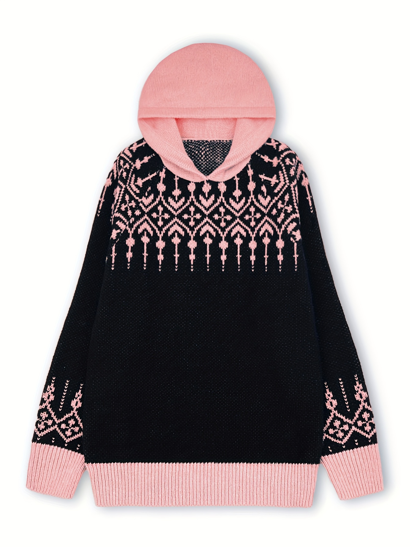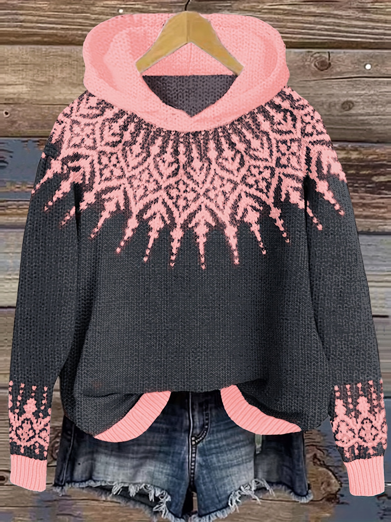 Women'S Elegant Hooded Sweatshirt - & Teal Color Block Pullover with Snowflake Pattern, Cozy Winter Sweater for Everyday & Formal Outfits