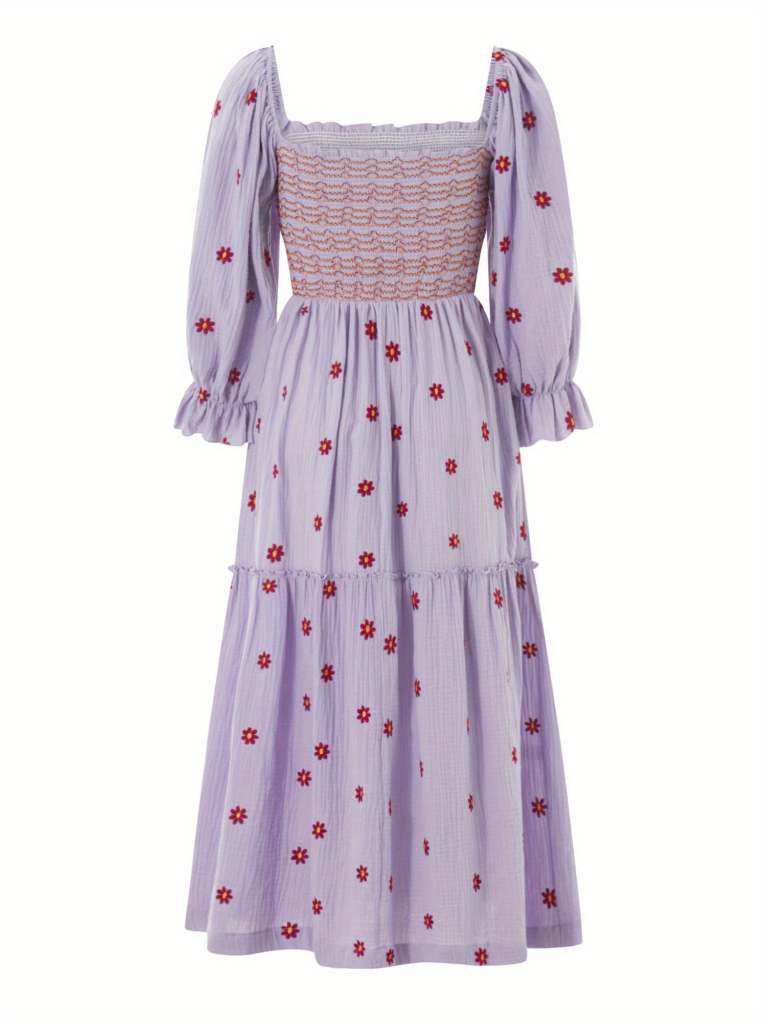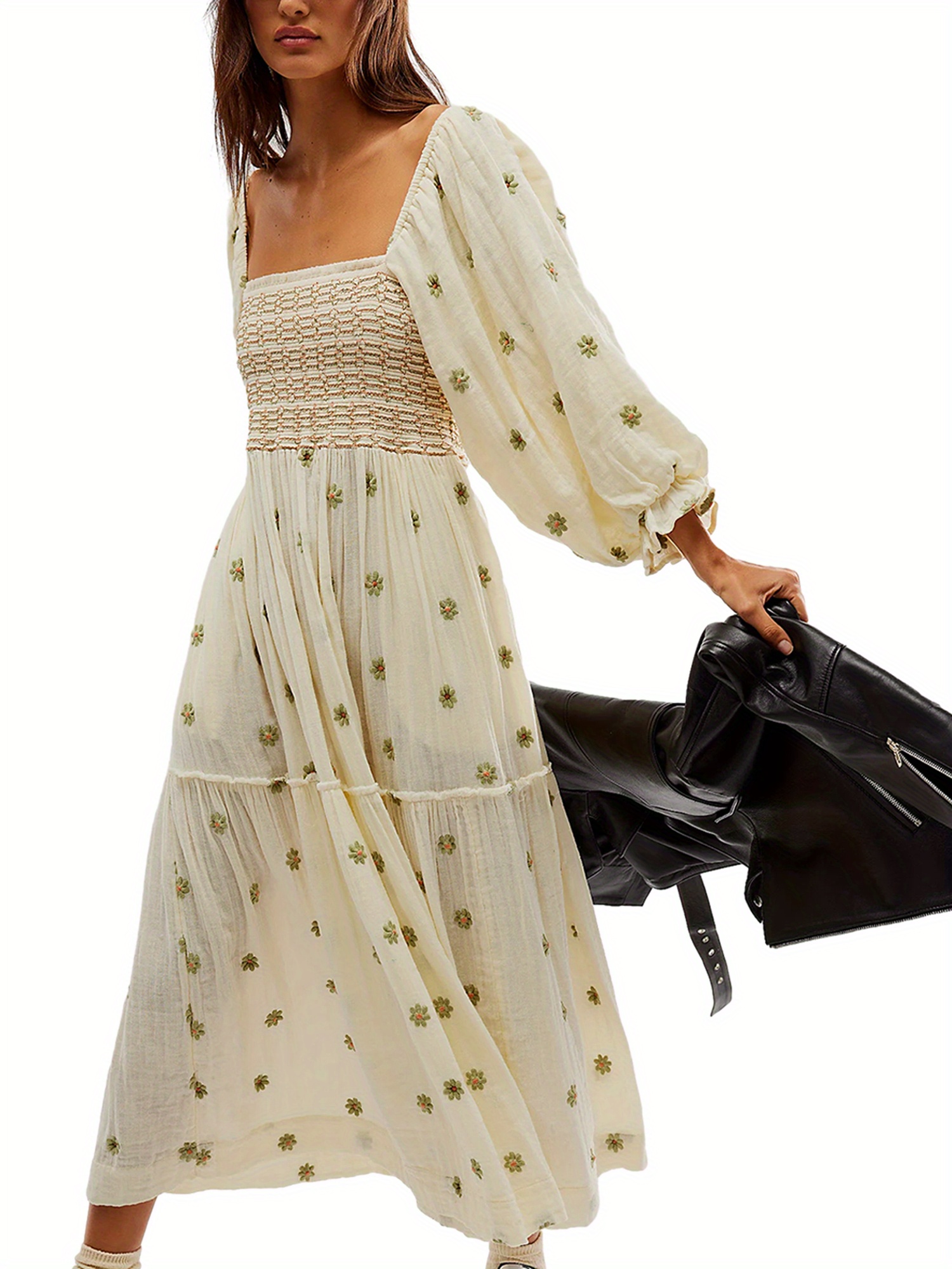 Women'S Floral Embroidered Maxi Dress with Puff Sleeves, Square Neck, Draped Tiered A-Line Skirt, 100% Polyester, Casual Summer Knit Fabric - Flowy Long Dress