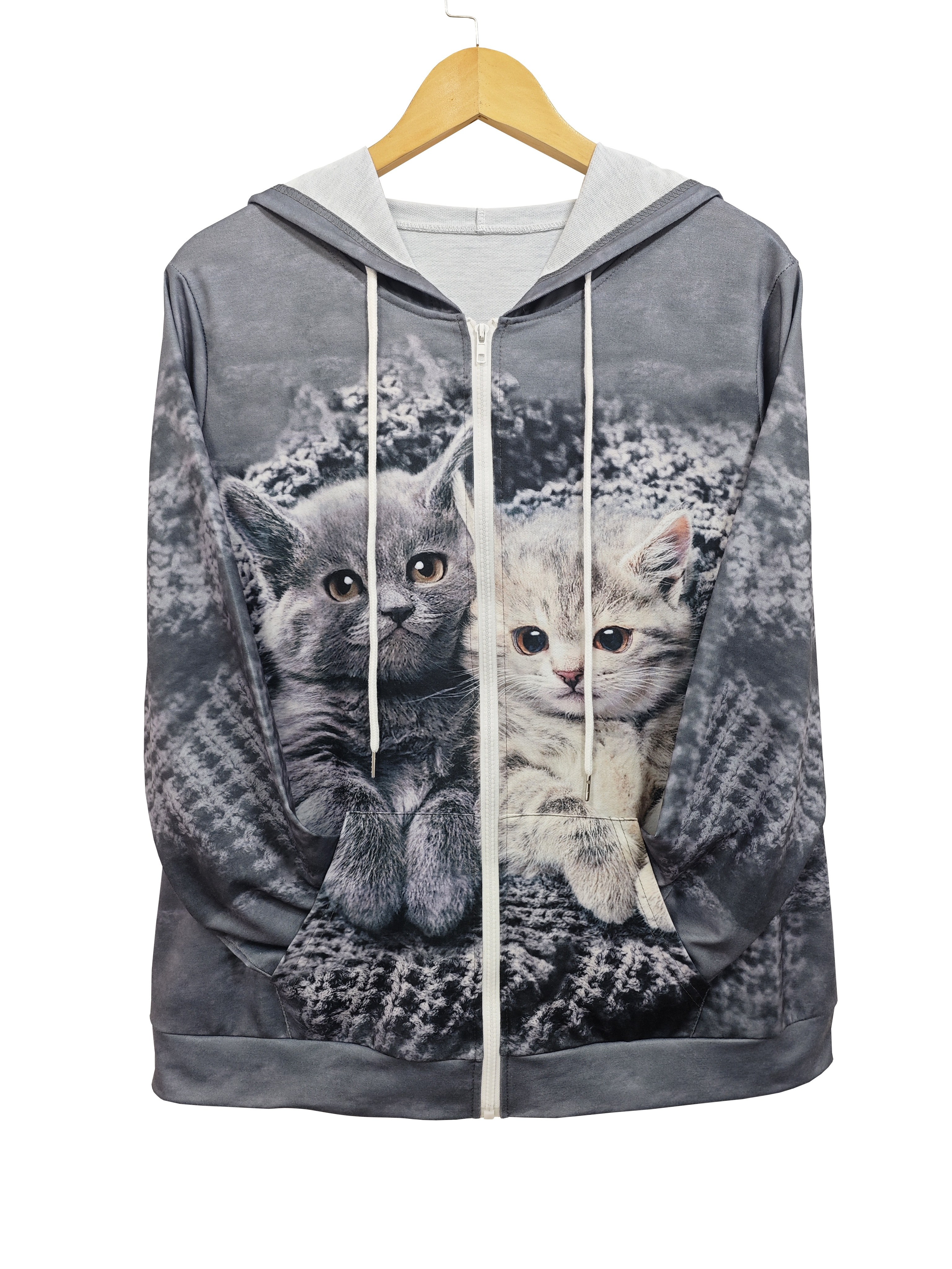 Chic Plus Size Cat Print Hooded Jacket with Pockets - Zip-Up, Long Sleeve, Polyester Blend - Elegant Women's Outerwear