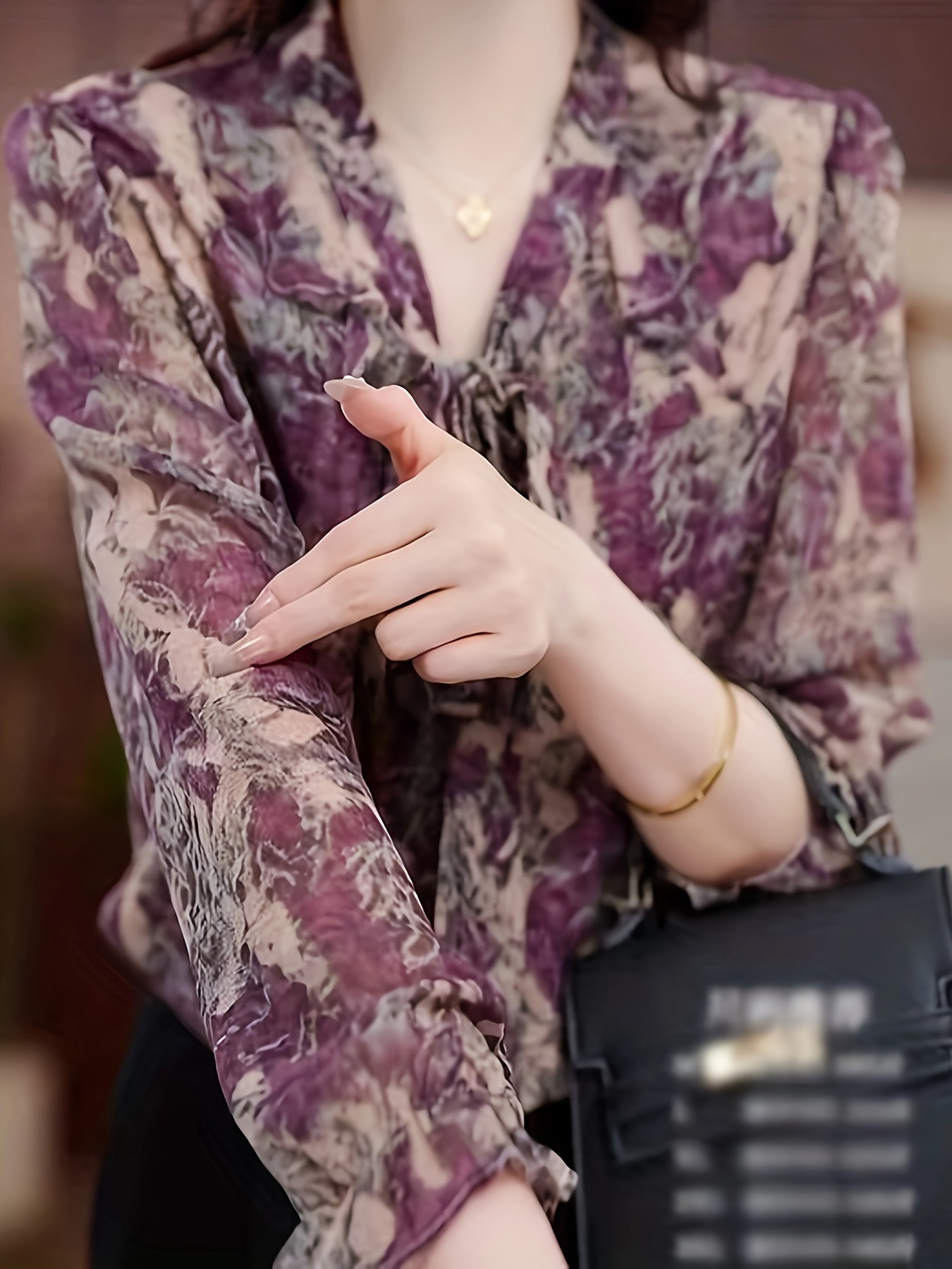 Plus Size - Elegant Floral Print Blouse with Tie-Neck Detail - Long Sleeve, Button-Up Shirt for Women, Black & White Swirl Design, Perfect for Casual or Formal Occasions, Versatile Fashion Piece | Tie Neck Blouse | Nonstretch Fabric