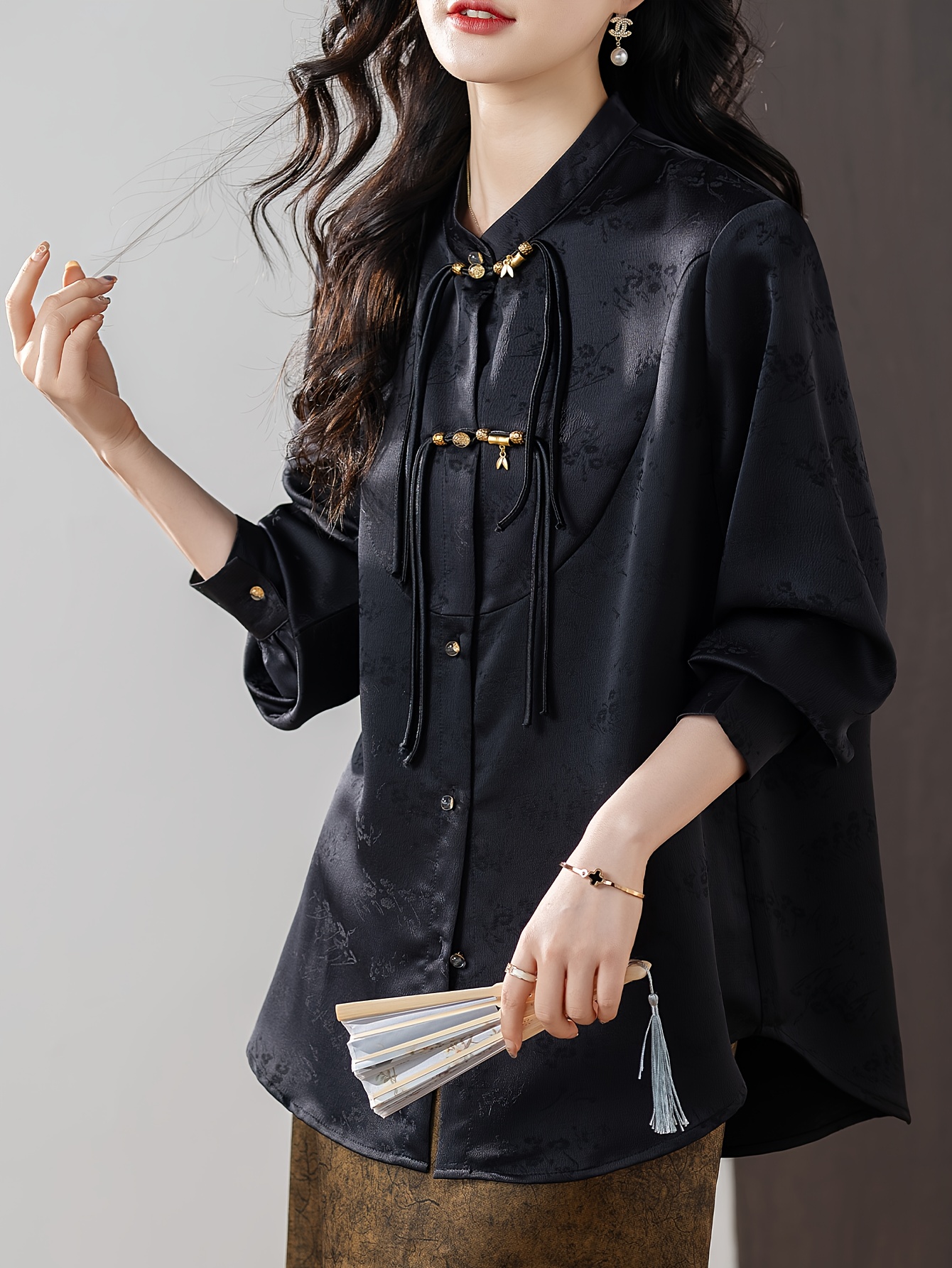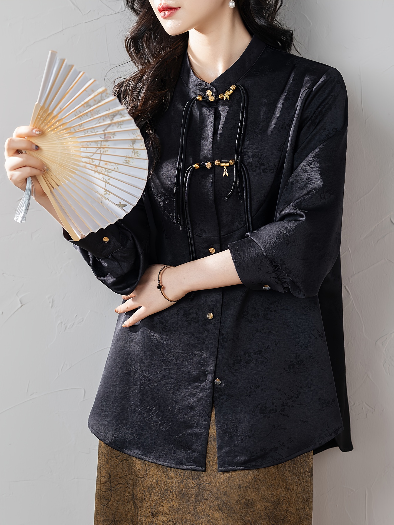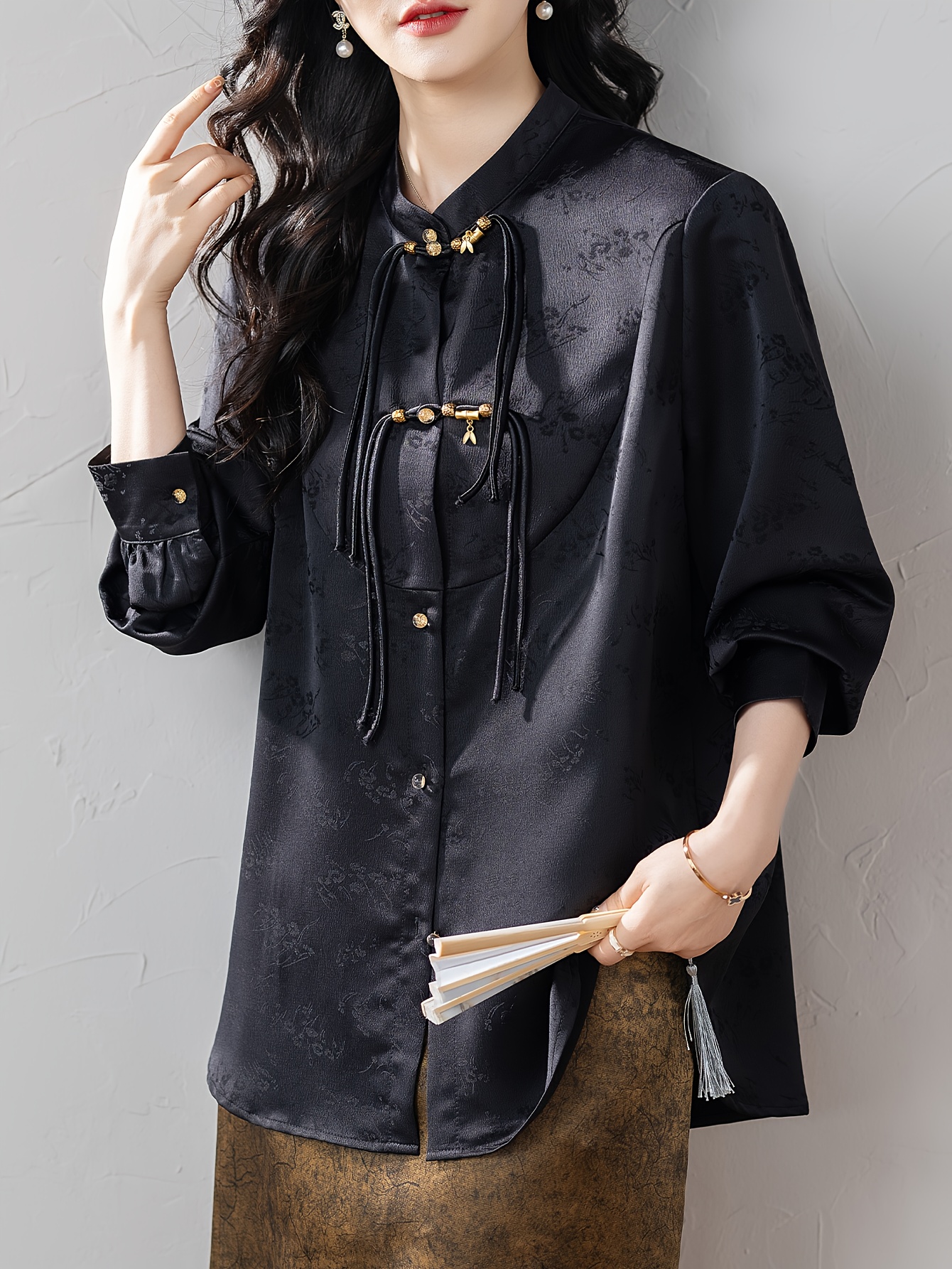 Plus Size - Women'S Elegant Chinese Blouse - Classic White Button-Front Shirt with Rounded Neckline, Non-Transparent Formal & Everyday Blouse for Office, Wedding, Party - Spring/Fall Women'S Clothing - Elegant Traditional Asian Attire, Chinese Style Clothing, Office Wear, Nontransparent Fabric, Wedding Attire, Vintage Design, Durable Material, Stylish Top, Fashion Lovers, Office Attire, Long Sleeve Shirt, Detail, Professional Women