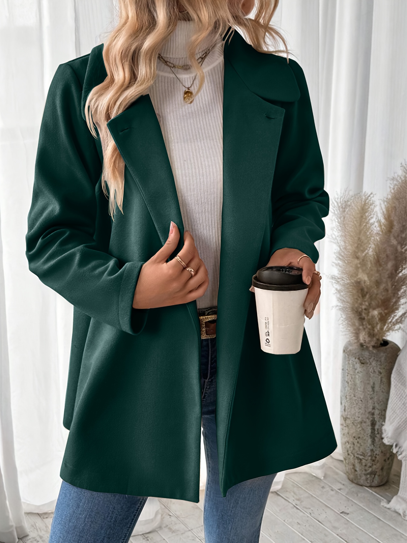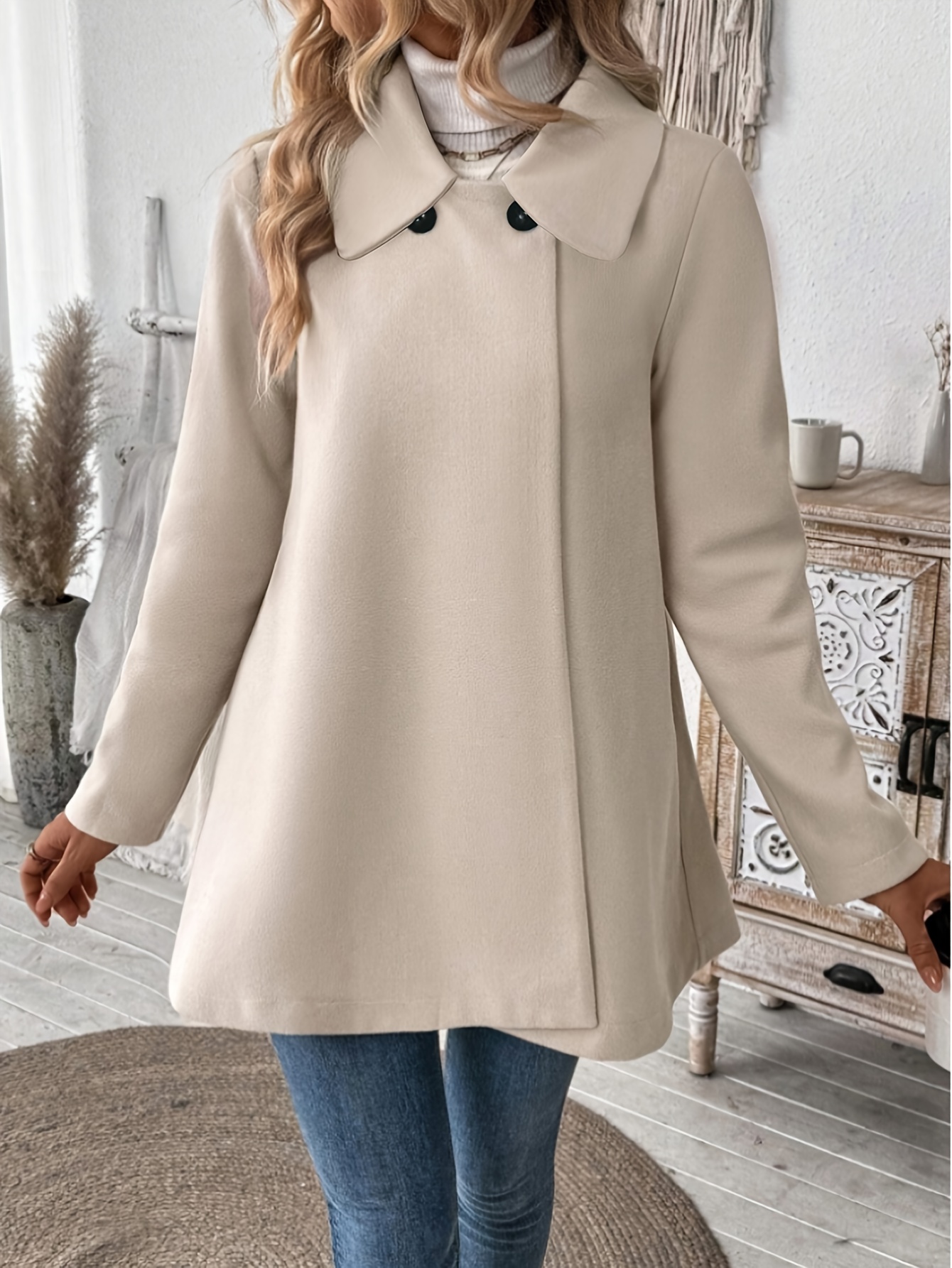 Plus Size, Women's Elegant Beige Coat - Long Sleeve Double Button Blazer, Structured Non-Stretch Jacket for Office, Formal Events & Everyday - Machine Washable Women's Outerwear, Casual Chic Apparel, Turndown Collar, Classic Tailoring