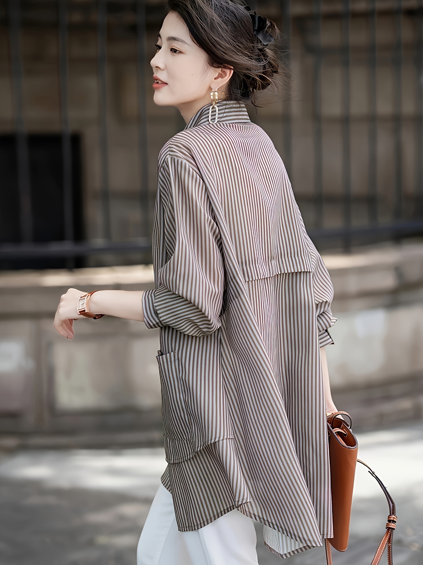 Plus Size, Fall Turn- Collar Loose Fit Versatile Striped Casual Comfortable Commuter Top Plus Size Women's Clothing, Everyday Top, Casual Wear, Striped Blouse, Relaxed Fit Shirt, Durable Construction, Breathable Material, Women's Blouse, Stylish Tee, Office Casual, Working Women