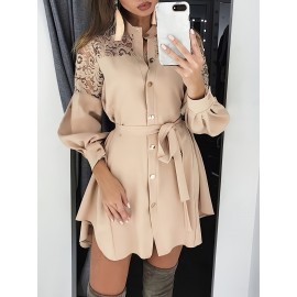 Elegant Slim Fit Solid Color Midi Dress with Waist Tie and Button Front - Chic Flared Silhouette, Long Sleeves, and Belted Waistband for a Sophisticated Look, A-Neck Style, Perfect for All Seasons, Stylish Women'S Dress, Perfect for Parties and Events