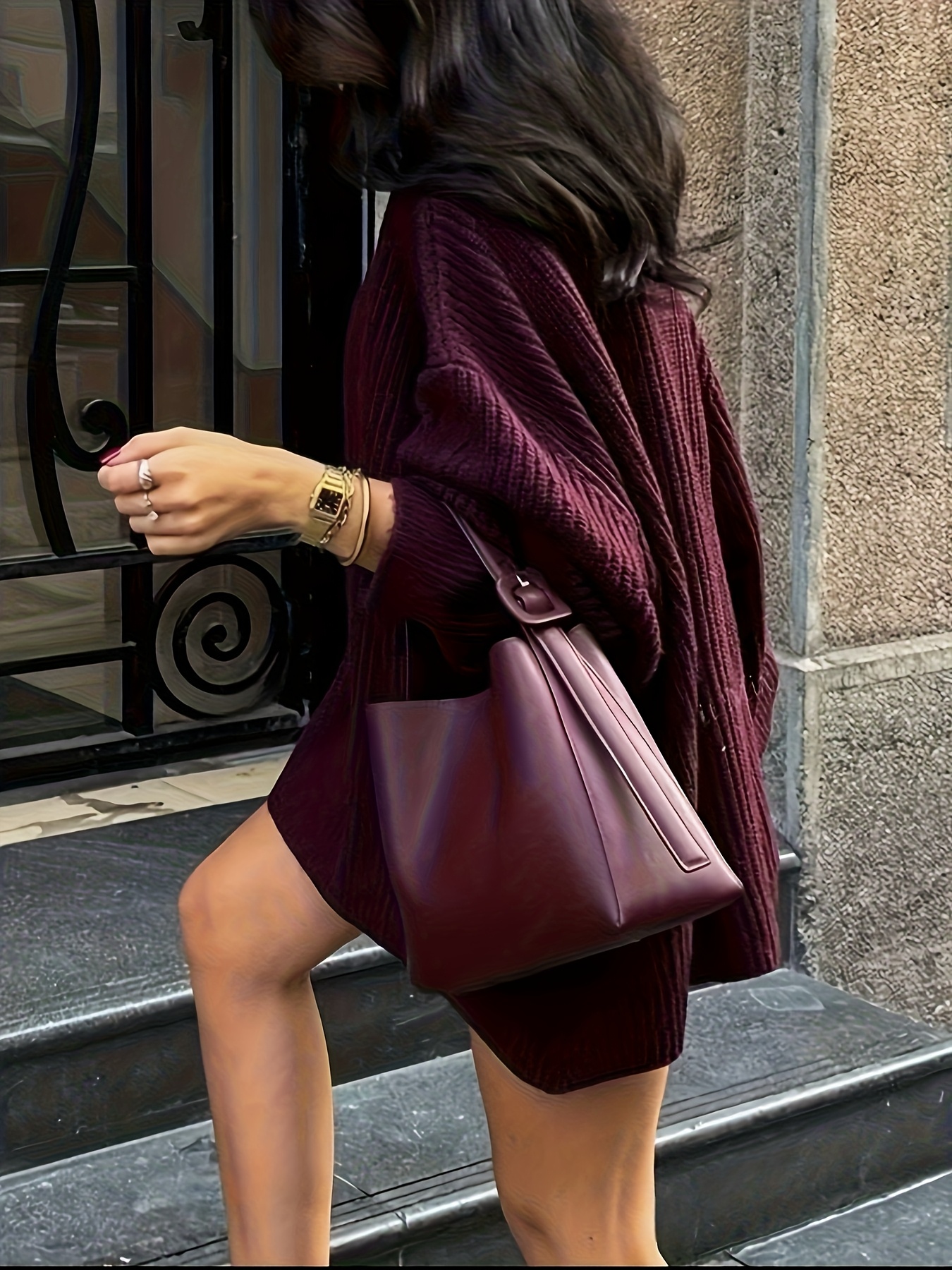 Women's Elegant Oversized Long Sleeve Sweater - Burgundy (Deep Red) All-Season Round Neck Sweater Coat, Loose Fit Tunic Jacket for Casual & Formal Wear, Machine Washable Versatile Blazer