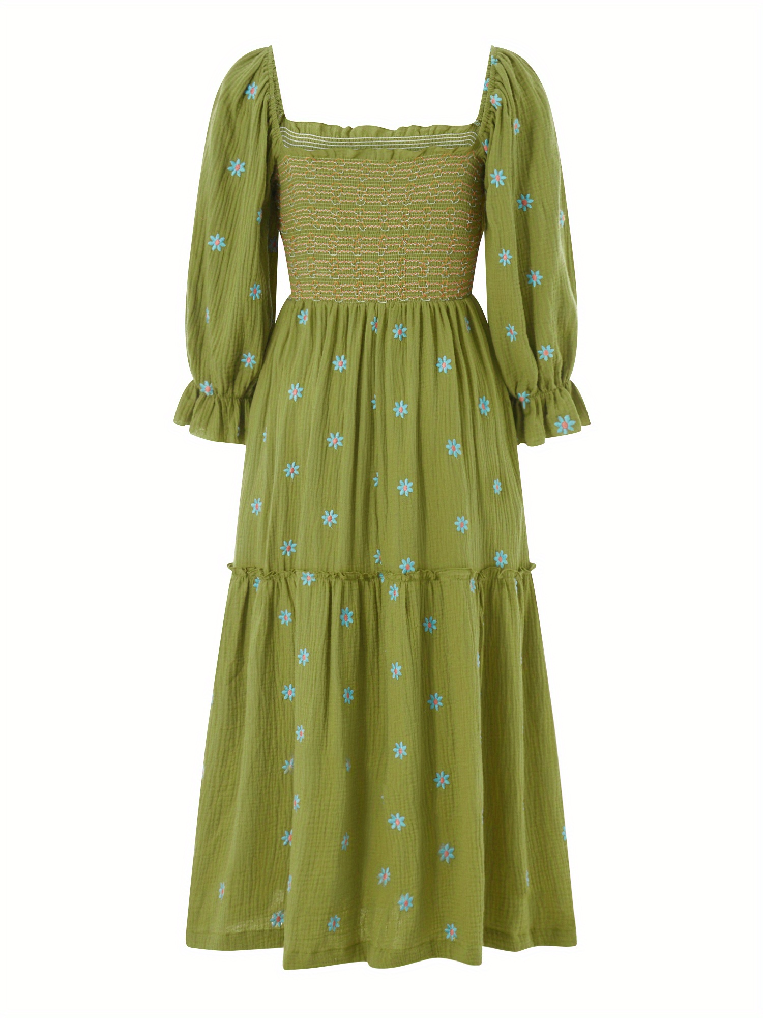 Women'S Floral Embroidered Maxi Dress with Puff Sleeves, Square Neck, Draped Tiered A-Line Skirt, 100% Polyester, Casual Summer Knit Fabric - Flowy Long Dress