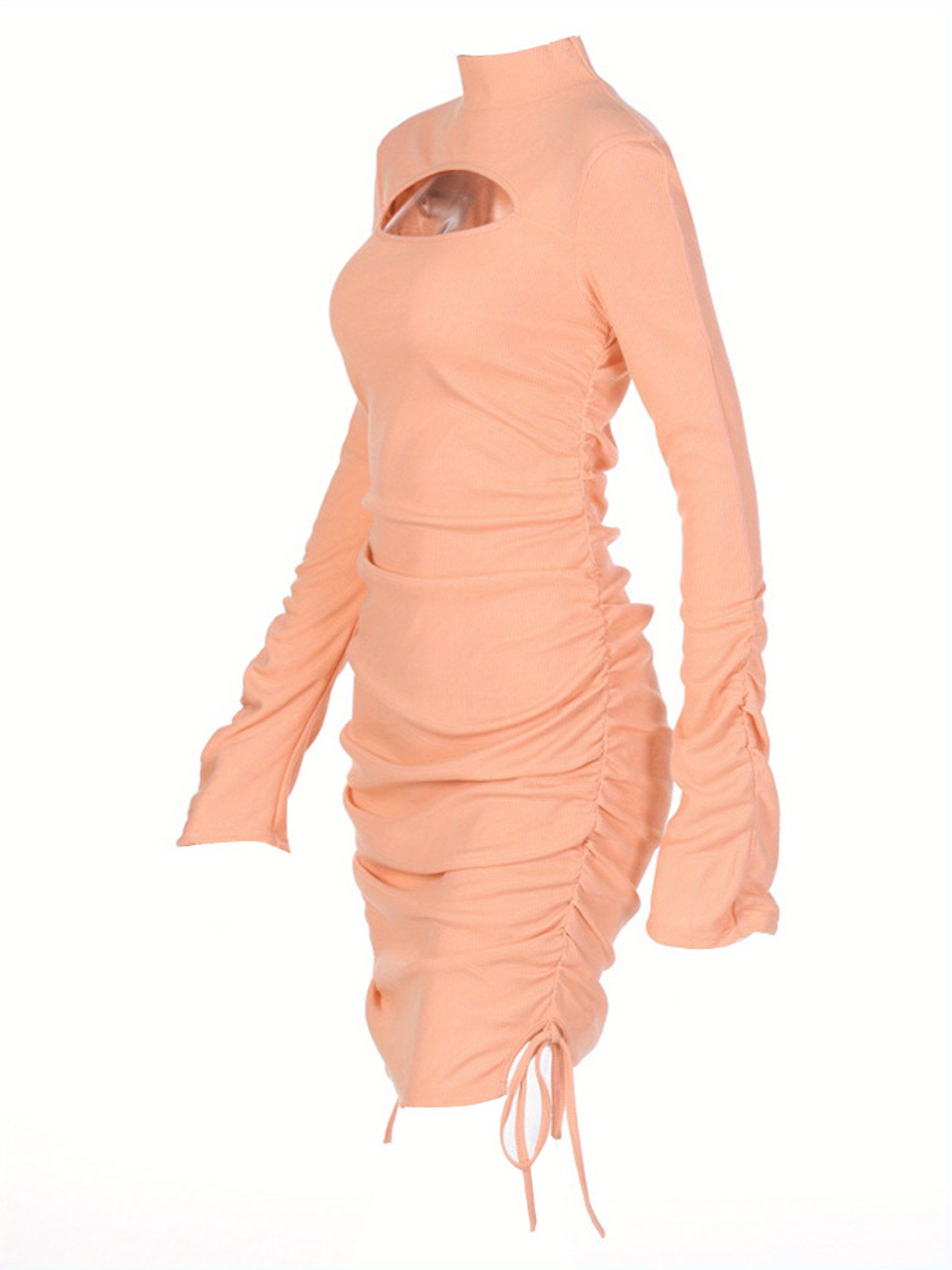 Women'S High Neck Long Sleeve Bodycon Mini Dress with Front Cutout and Side Ruching Drawstrings, Solid Color Soft Cotton Blend, Versatile & Seasonless