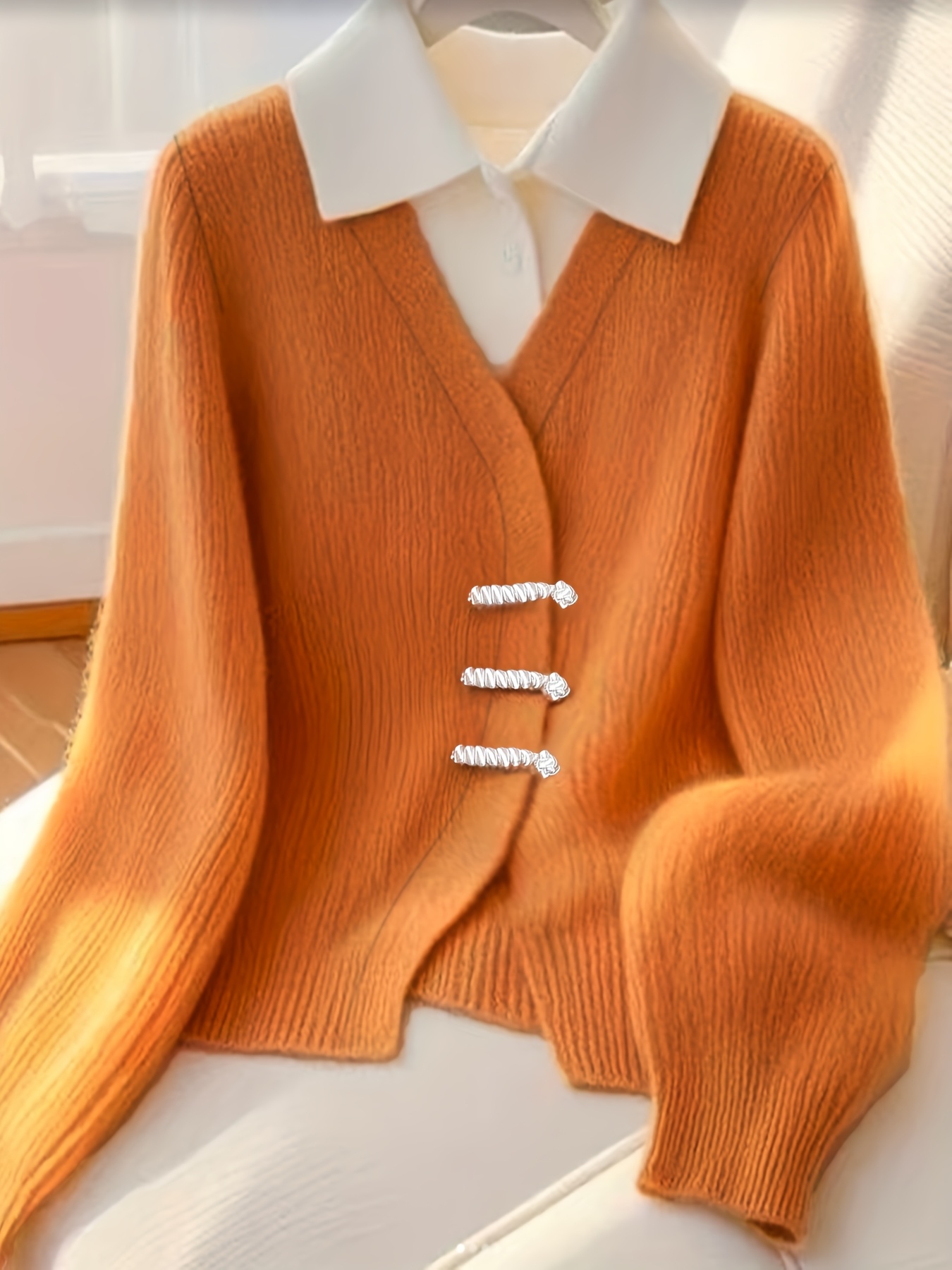 Women's Sweater with Collar - Elegant Fake Two-Piece design, Button-front placket, Machine Washable Sweater for Fall/Winter, Office Party Outfits - Warm Orange Sweater for Women