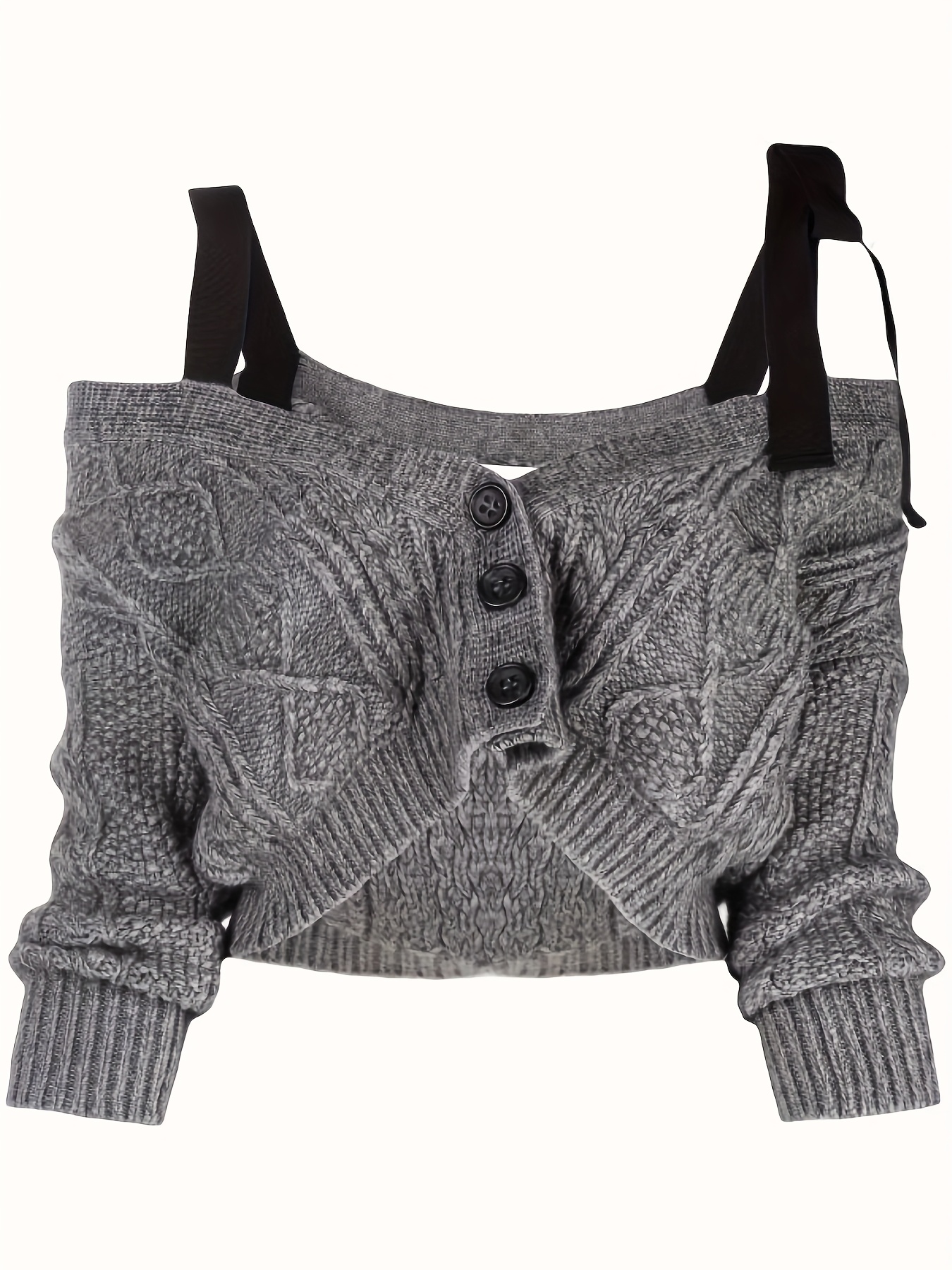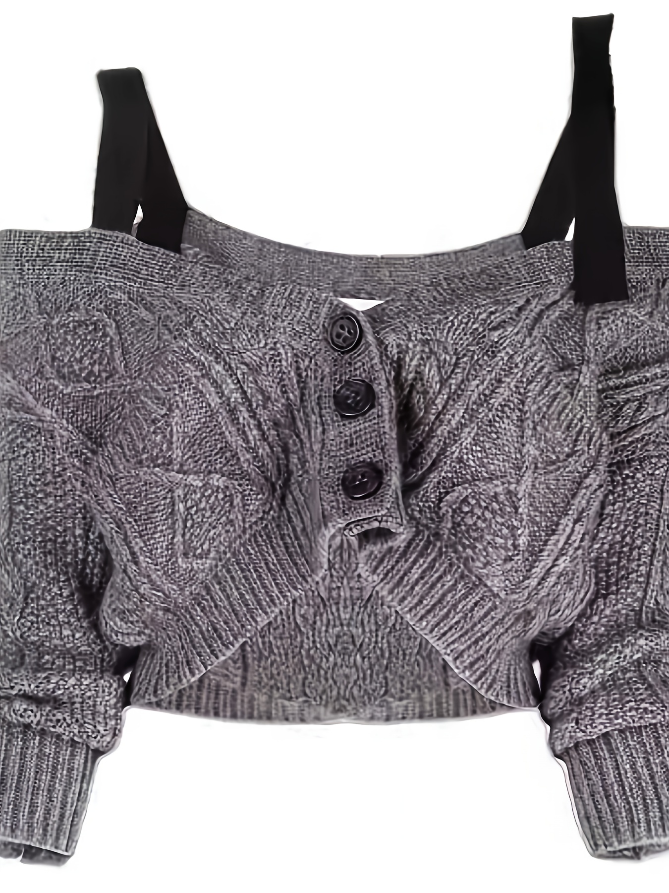 Women'S Chic Off-Shoulder Sweater - Sexy Cropped Top with Button Front, Fall Winter Outfits, Elegant Party Casual Attire - Women'S Fashion Sweater, Ladies Sweaters, Seasonal Wardrobe, Trendy Knitwear, Durable Construction, Buttonup Top, Adults, Casual Outfit, Soft Texture, Stylish Knitwear, Adults Fashion