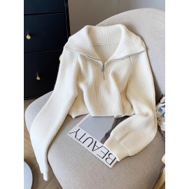 Women's Elegant Ribbed Zip-Up Sweater - Long Sleeve Stand Collar Short Length Slim Fit, Solid Color All-Season Versatile Layering Piece