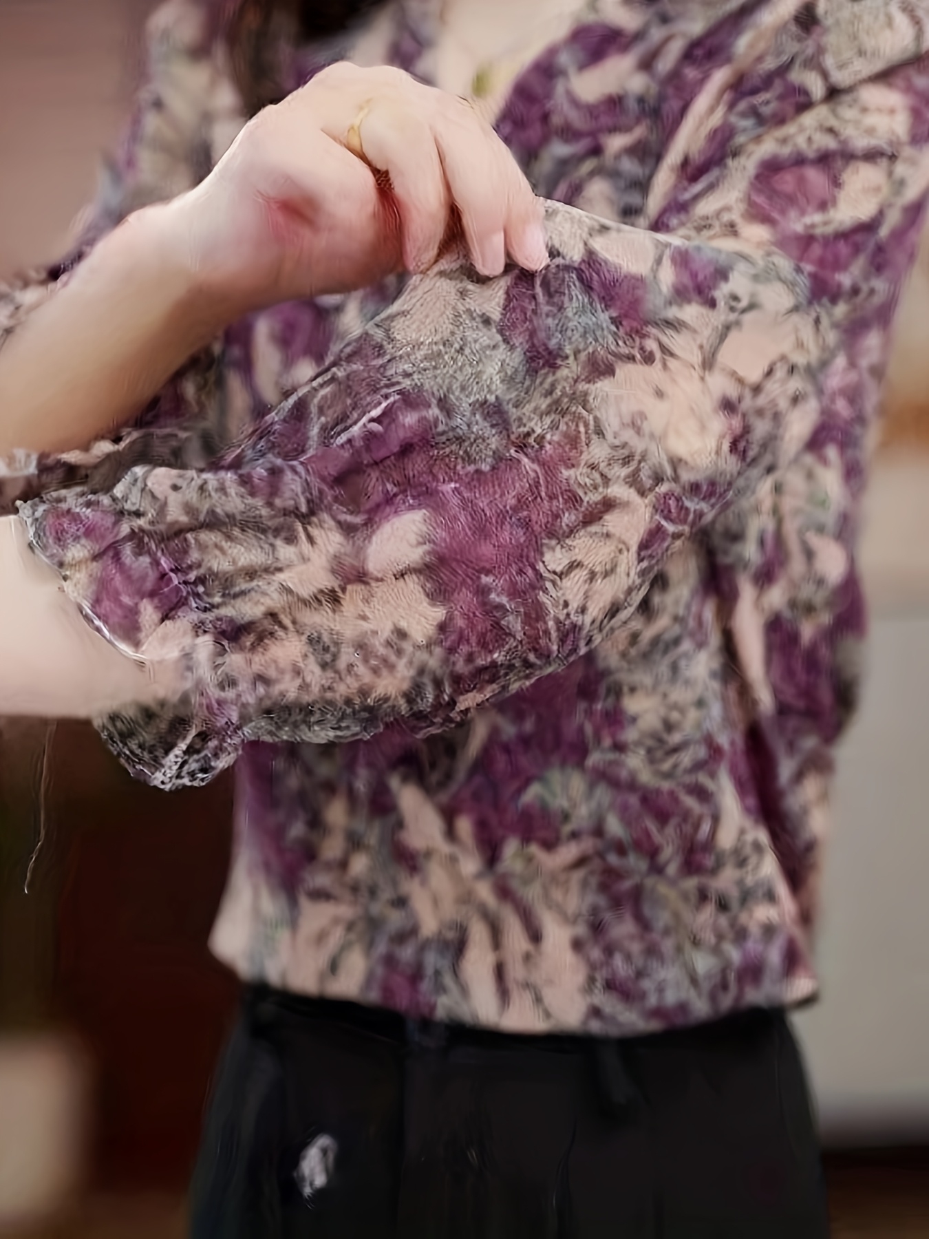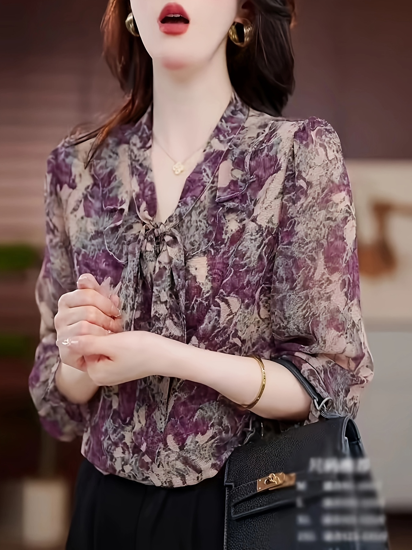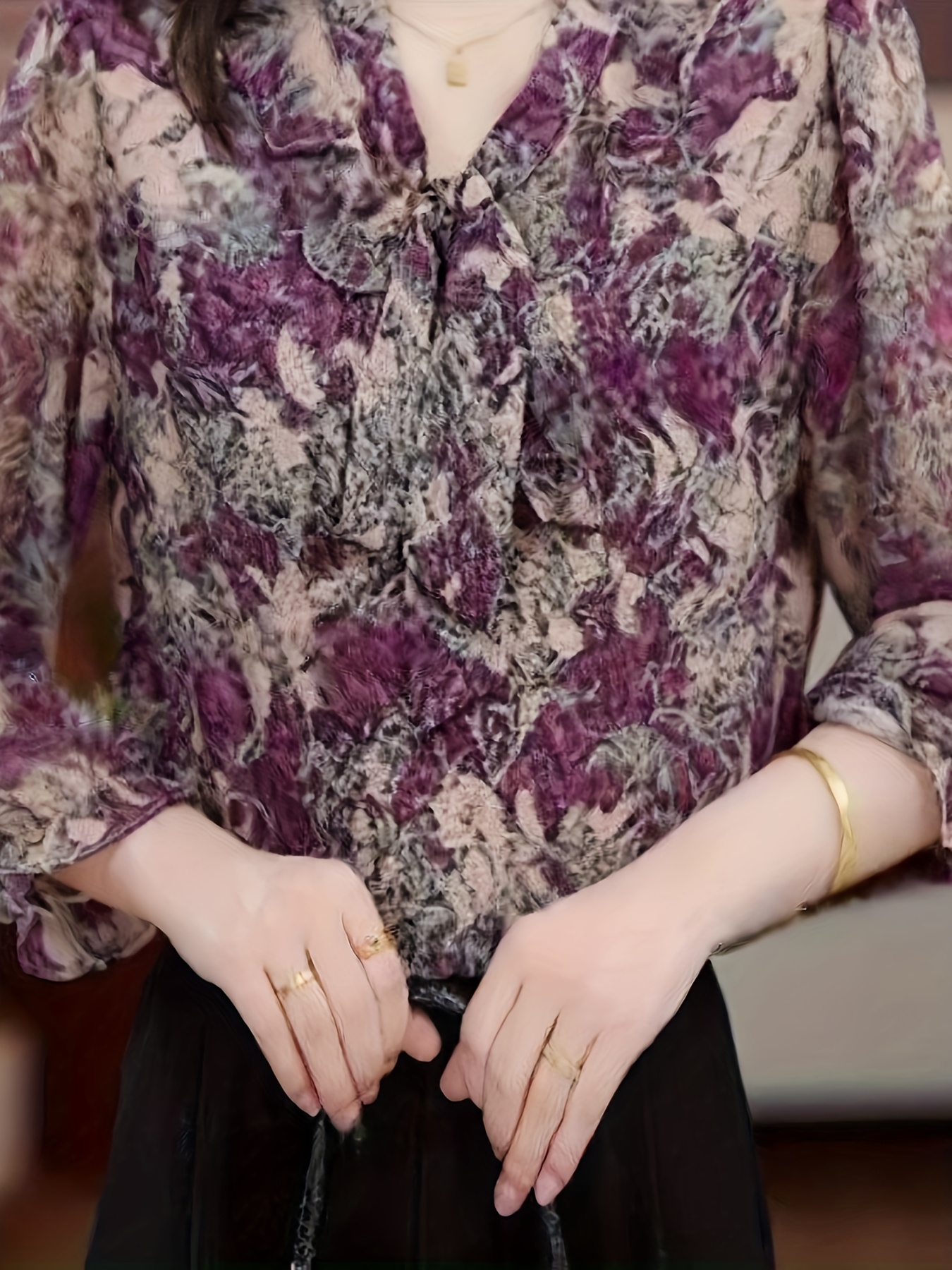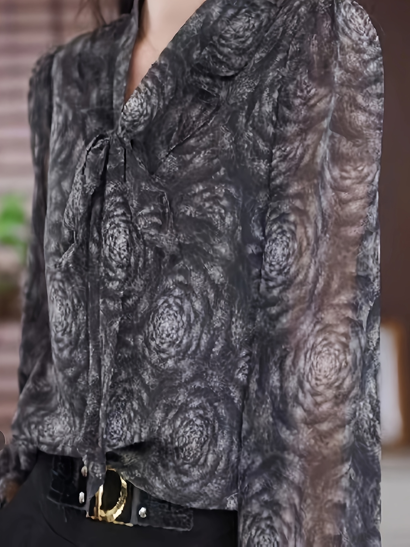 Plus Size - Elegant Floral Print Blouse with Tie-Neck Detail - Long Sleeve, Button-Up Shirt for Women, Black & White Swirl Design, Perfect for Casual or Formal Occasions, Versatile Fashion Piece | Tie Neck Blouse | Nonstretch Fabric