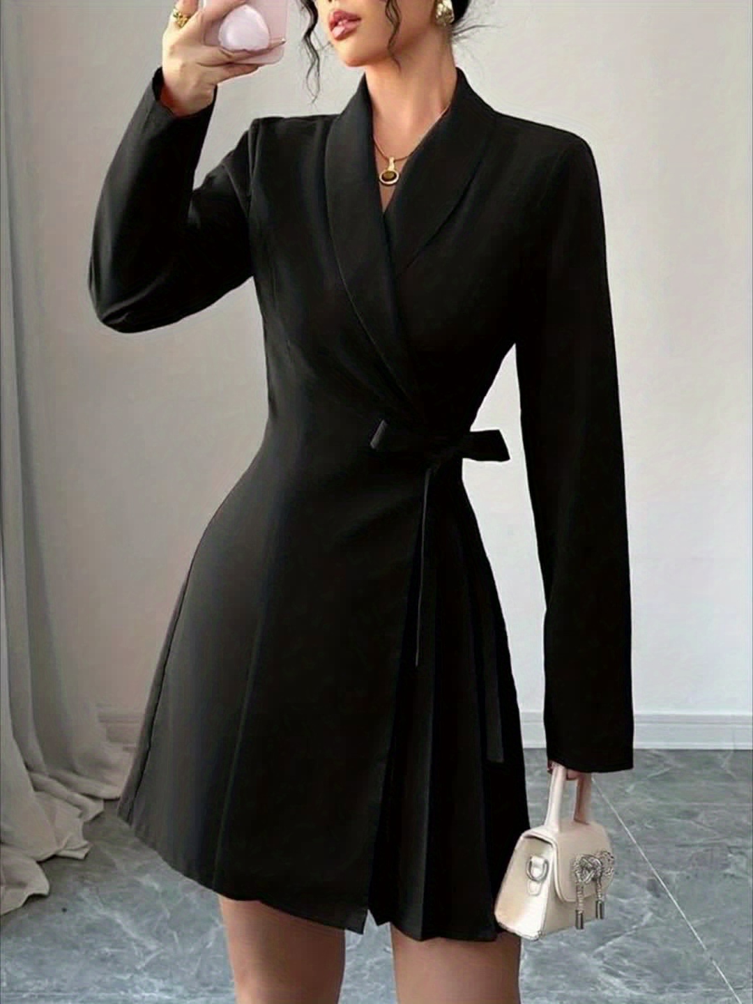 Elegant Lapel Long Sleeve Dress with Bow Tie and Pleats | Mid-Length, Solid Color, Fitted, Perfect for Spring/Fall, Commute and Party Essentials