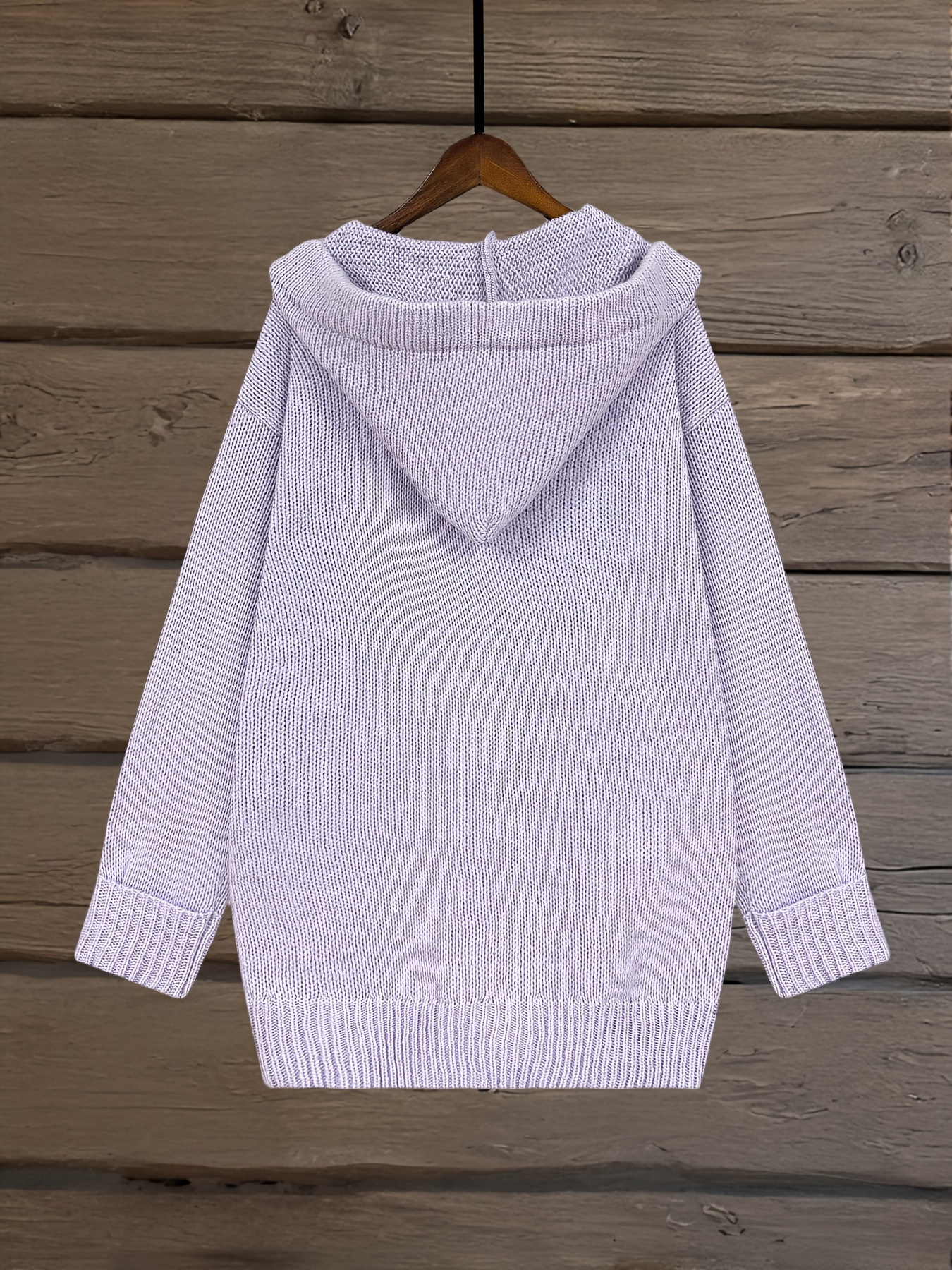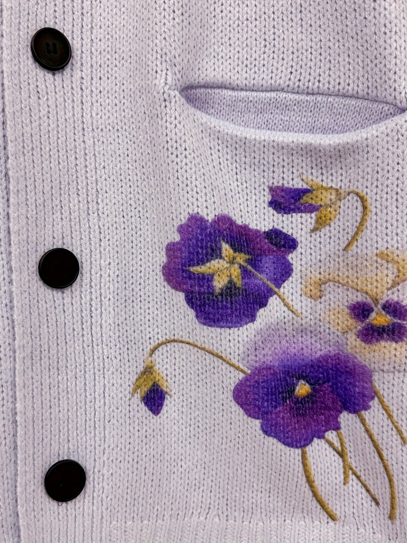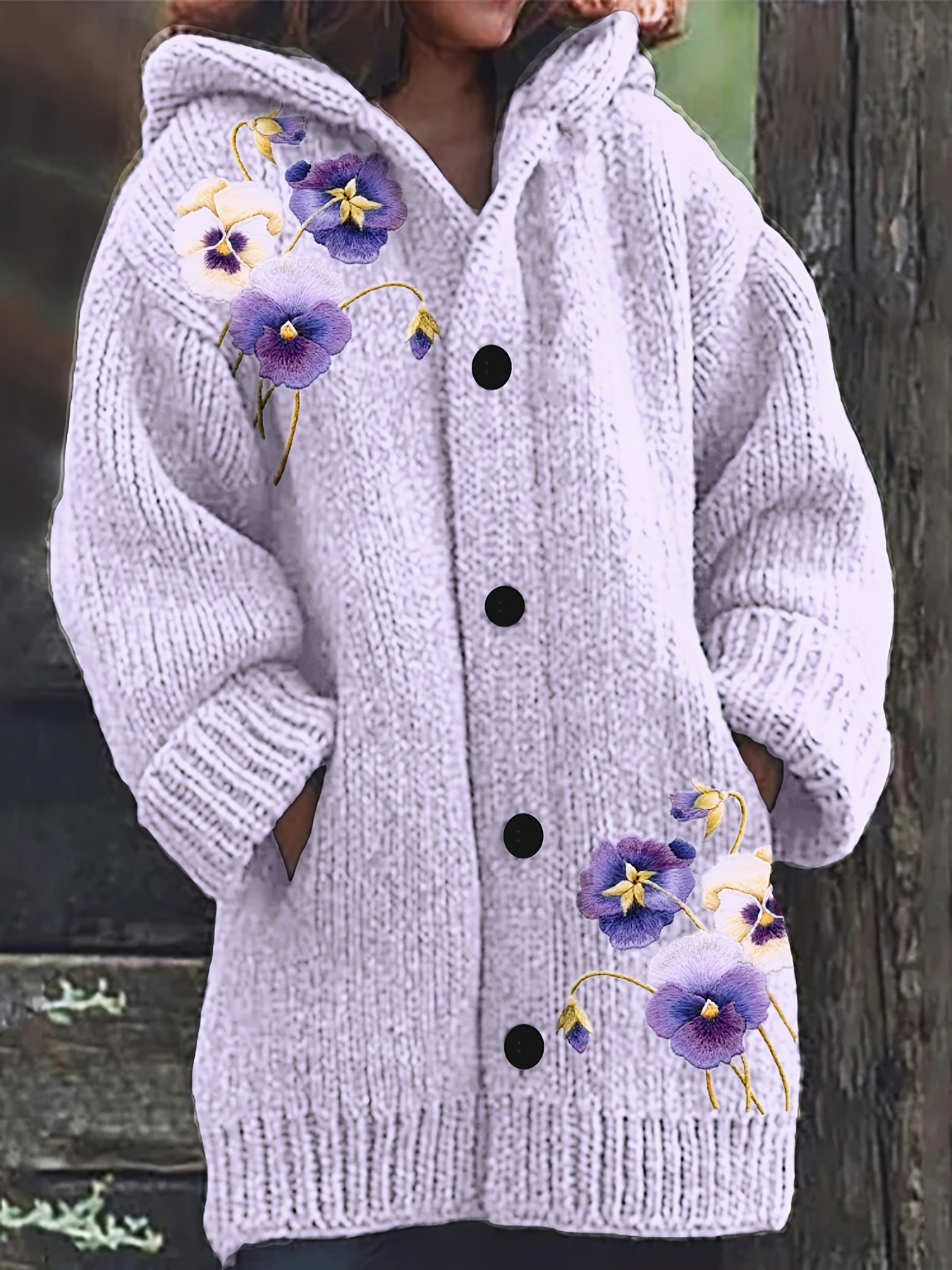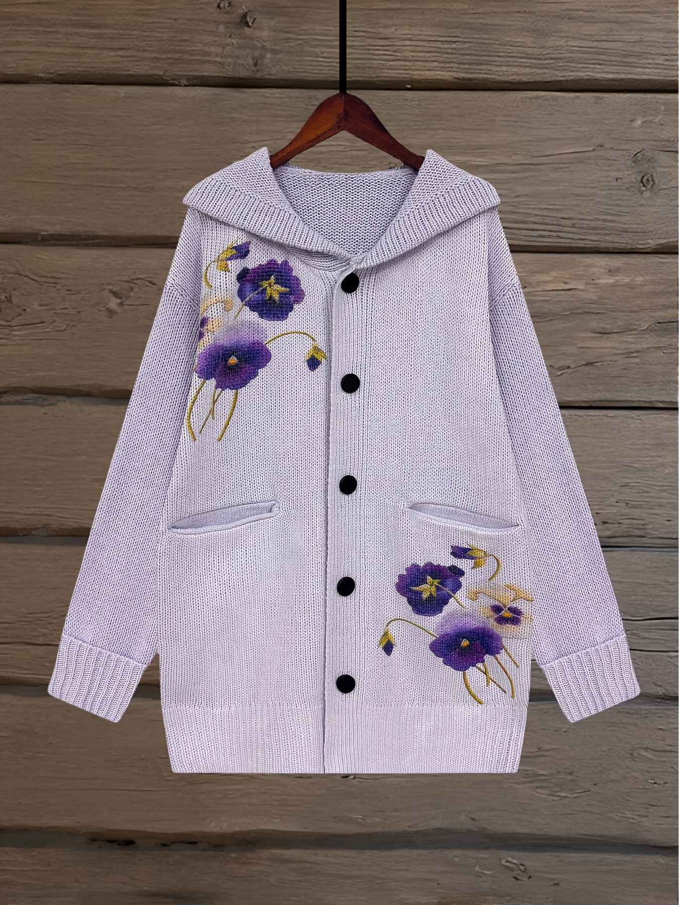 [Light Purple Hooded Sweater] European and American Retro Style Light Purple Hooded Thick Open Front Loose Long Sweater with Floral Print