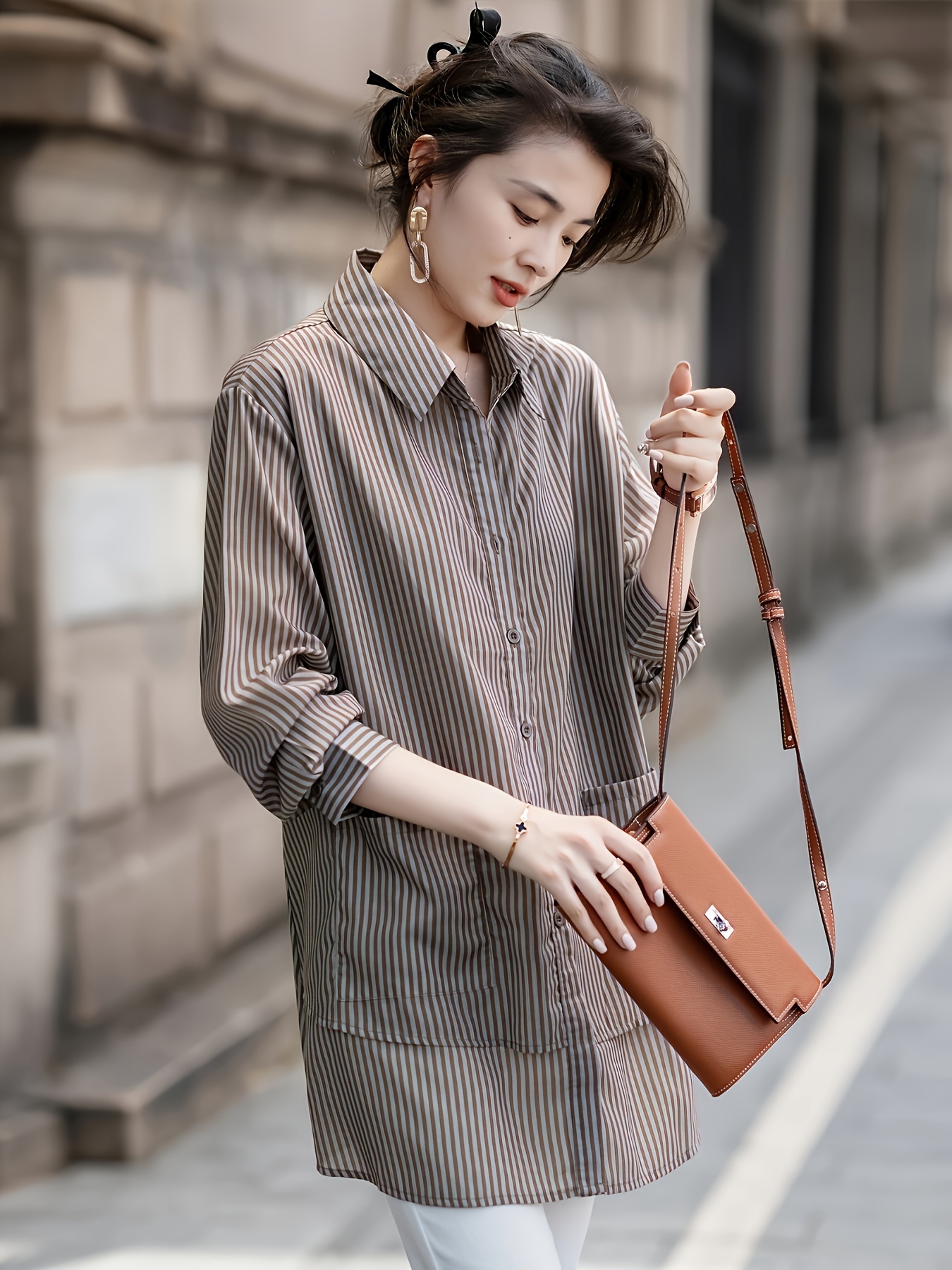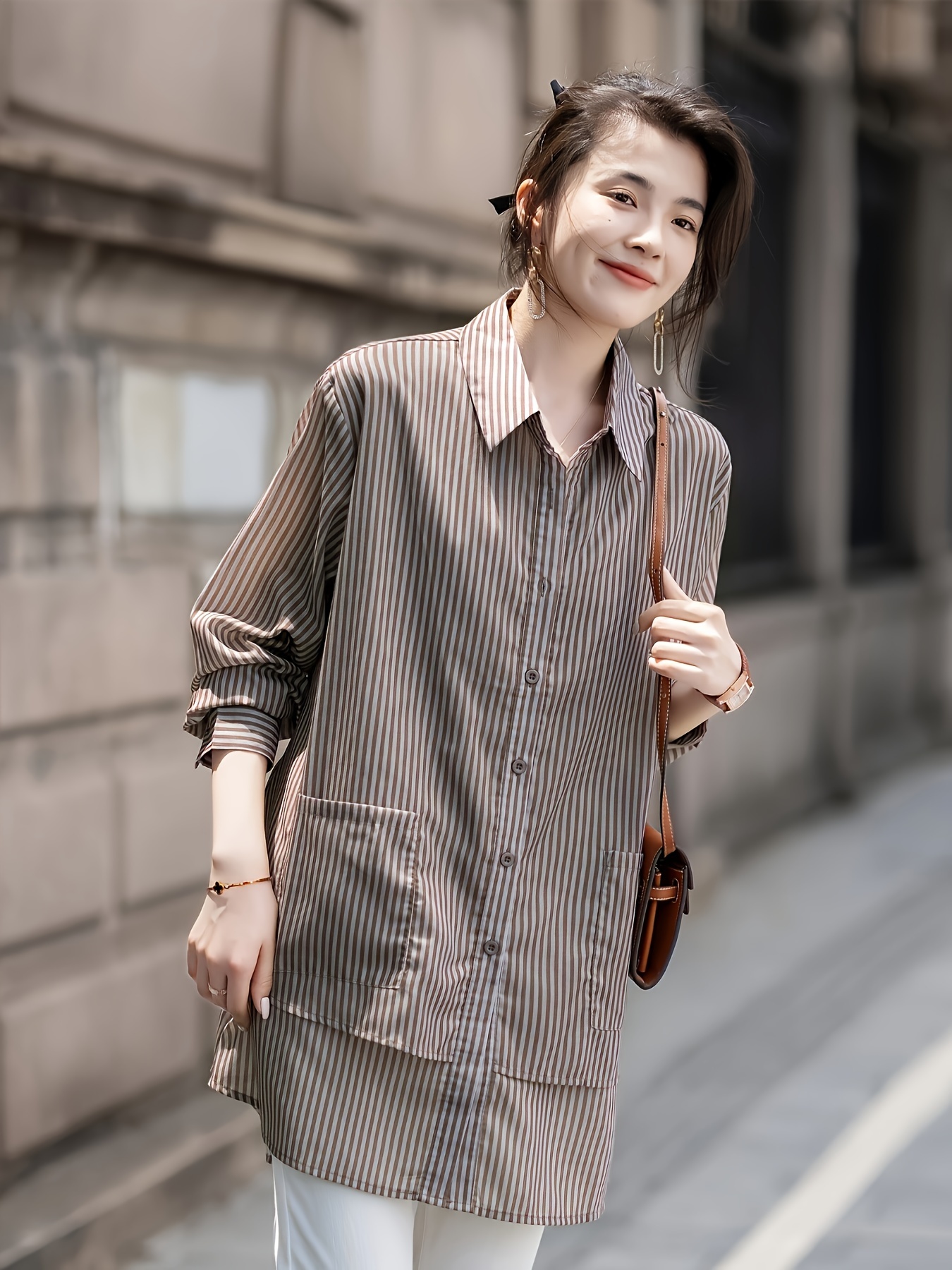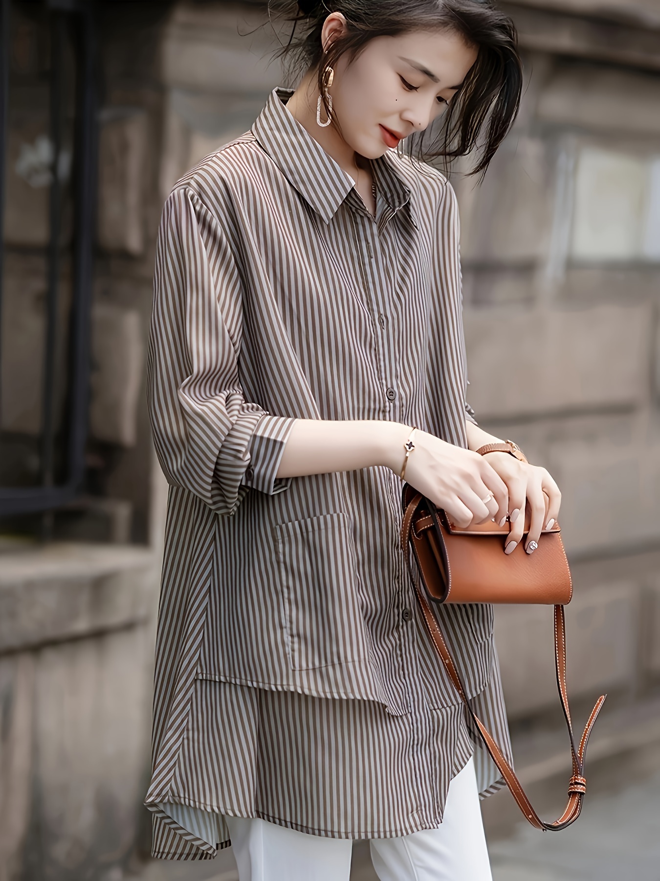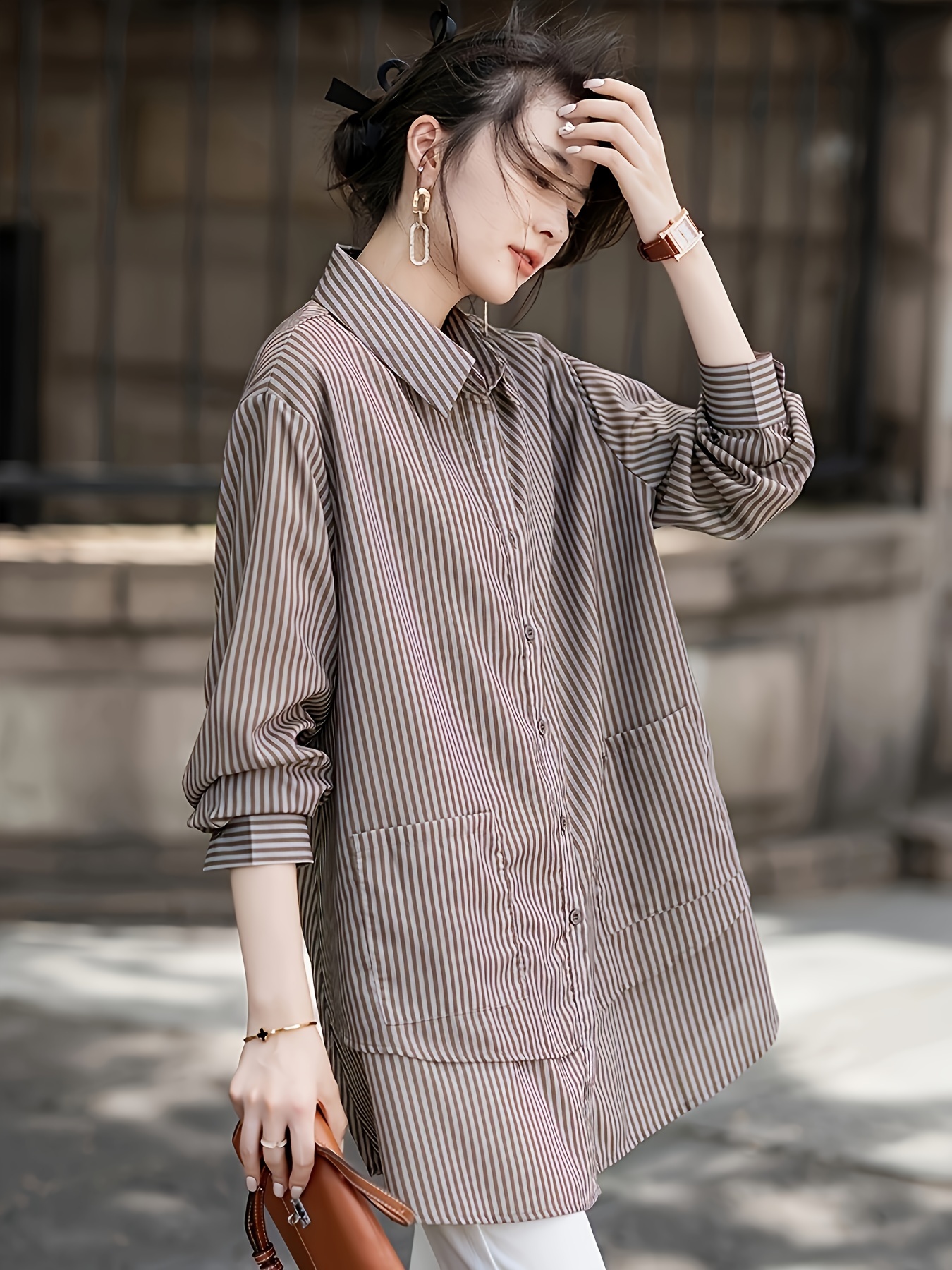 Plus Size, Fall Turn- Collar Loose Fit Versatile Striped Casual Comfortable Commuter Top Plus Size Women's Clothing, Everyday Top, Casual Wear, Striped Blouse, Relaxed Fit Shirt, Durable Construction, Breathable Material, Women's Blouse, Stylish Tee, Office Casual, Working Women