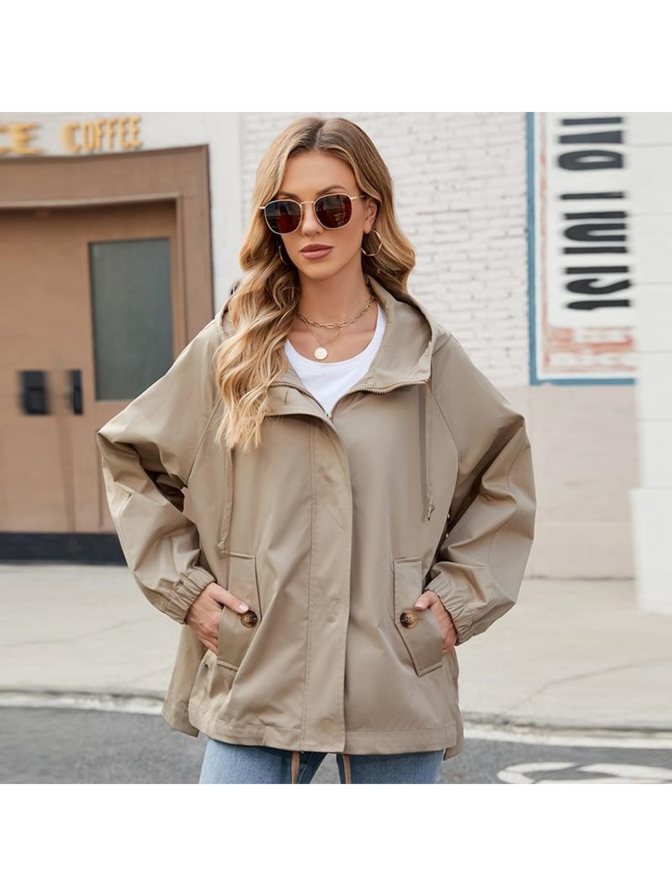 Plus Size - Plus Size Women'S Elegant Hooded Trench Coat - Loose-Fit Windproof Jacket with Double Zipper Closure, Long Sleeves & Belted Waist - /Neutral Tones - Spring/Fall