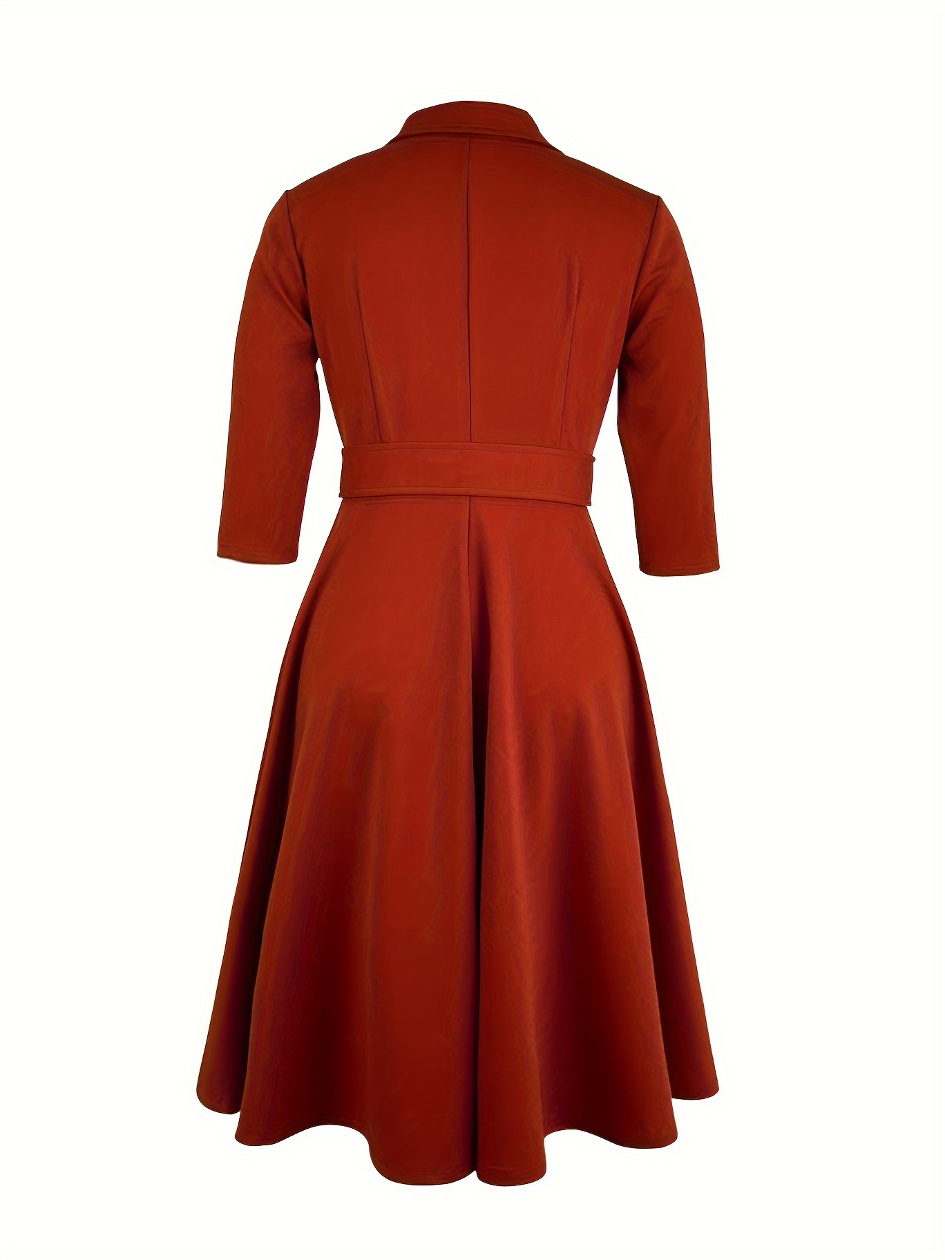 Single Breasted Three-quarter Sleeve Dress, Stylish Solid Lapel Collar Belted A-line Dress For Spring & Fall, Women's Clothing