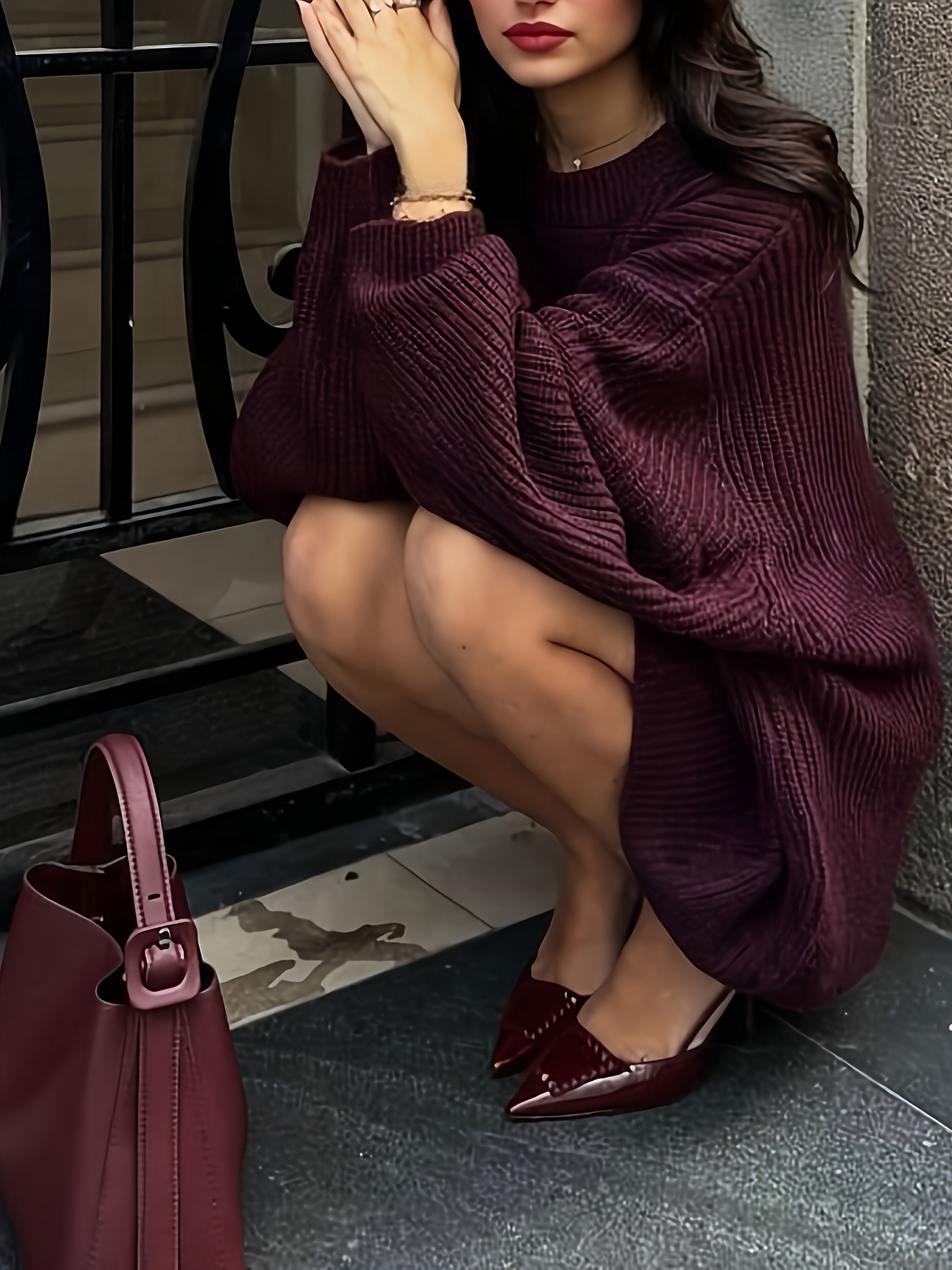Women's Elegant Oversized Long Sleeve Sweater - Burgundy (Deep Red) All-Season Round Neck Sweater Coat, Loose Fit Tunic Jacket for Casual & Formal Wear, Machine Washable Versatile Blazer