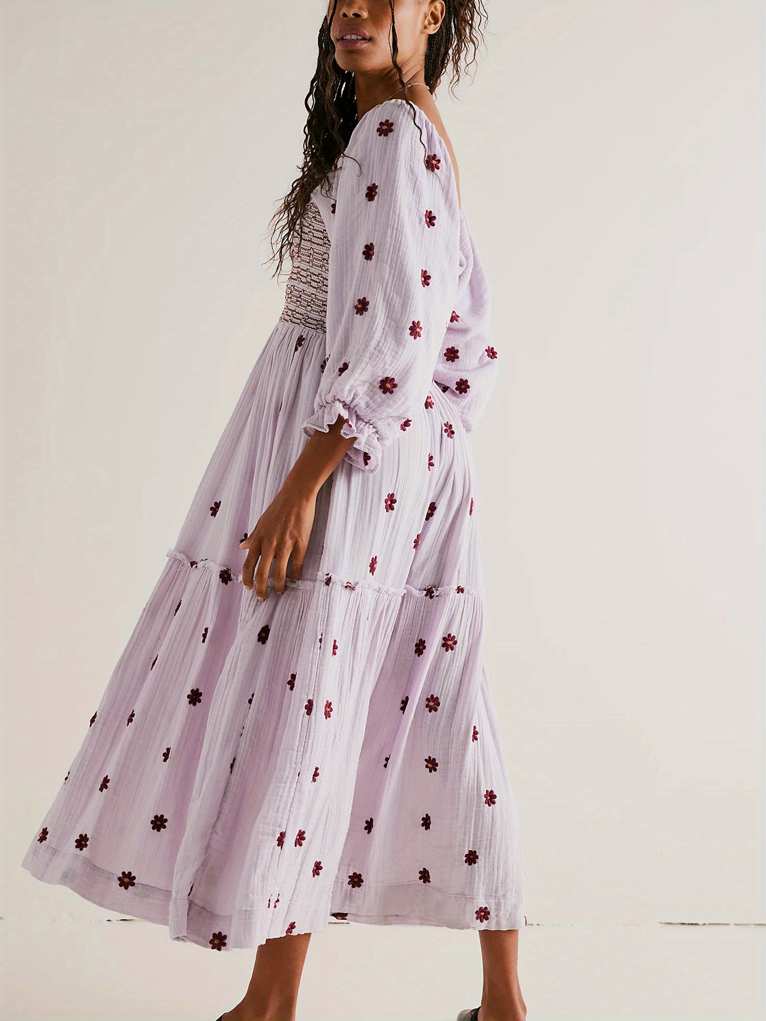 Women'S Floral Embroidered Maxi Dress with Puff Sleeves, Square Neck, Draped Tiered A-Line Skirt, 100% Polyester, Casual Summer Knit Fabric - Flowy Long Dress