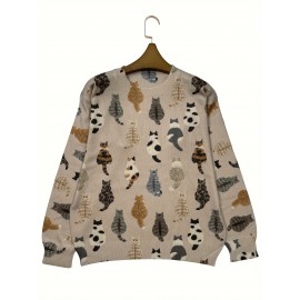 Women'S All-Over Cat Back Print Sweater - Soft & Brown Tabby Cat Design, Round Neck Long Sleeve Casual Sweater, Lightweight Everyday & Formal Outfits