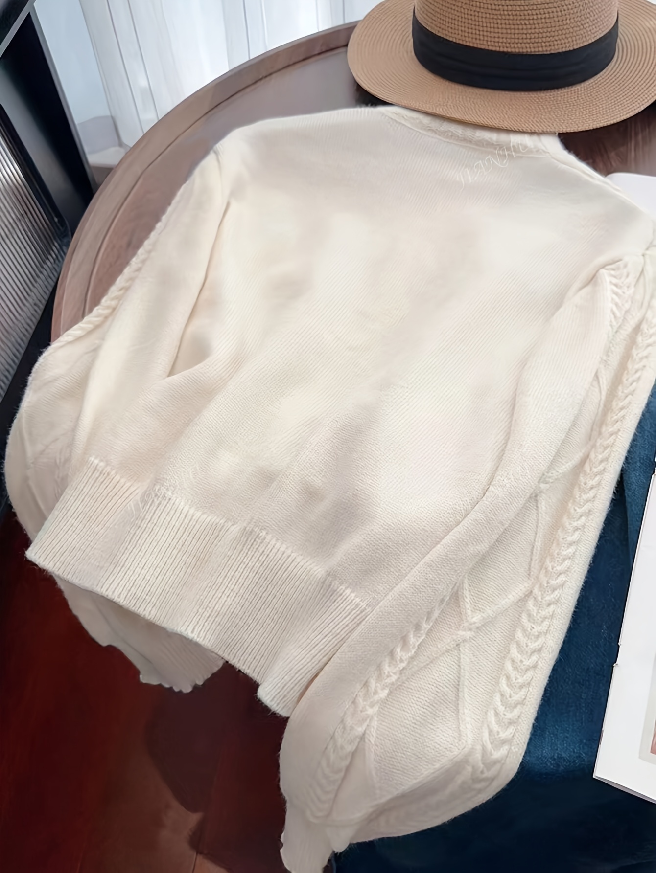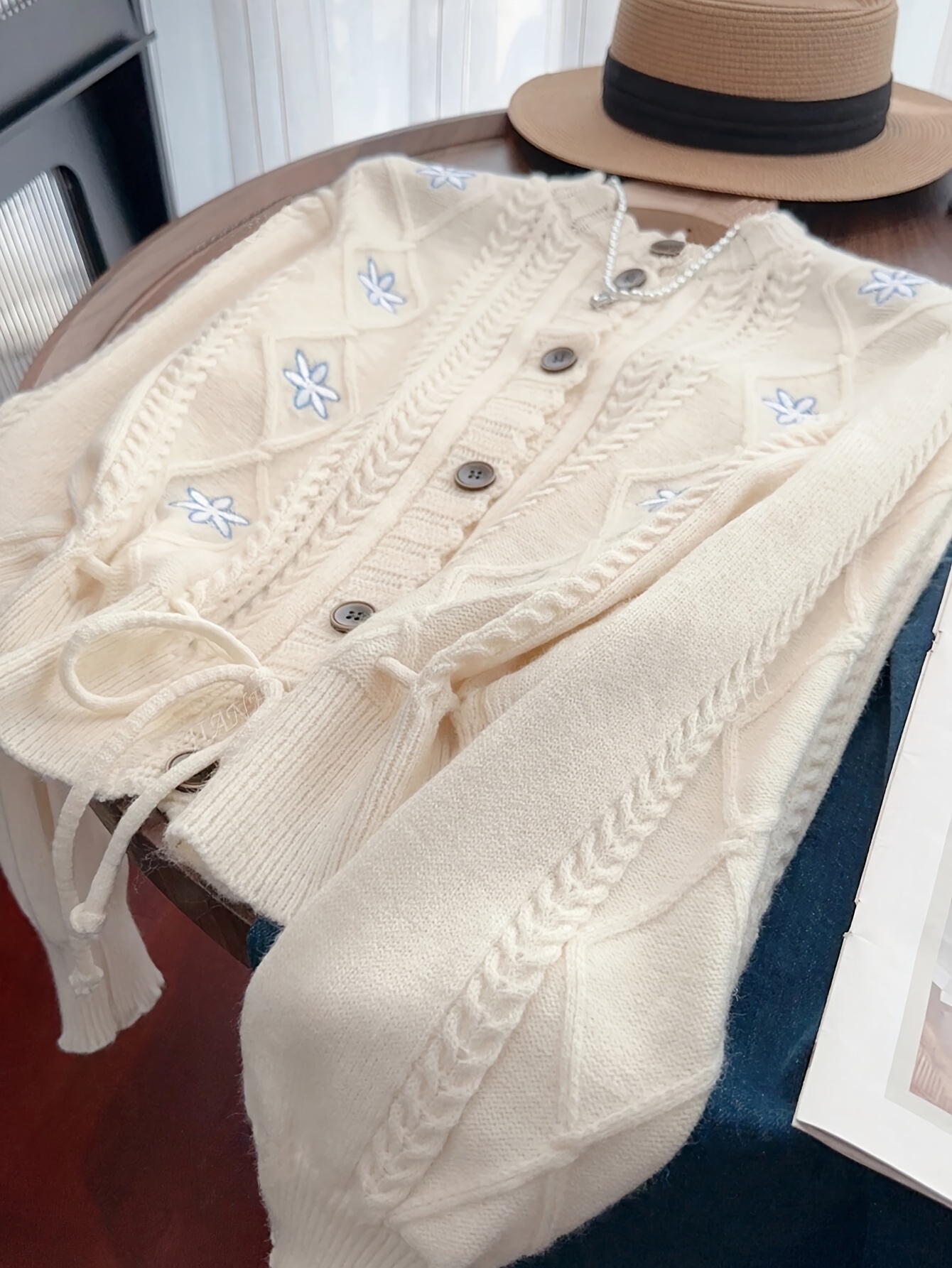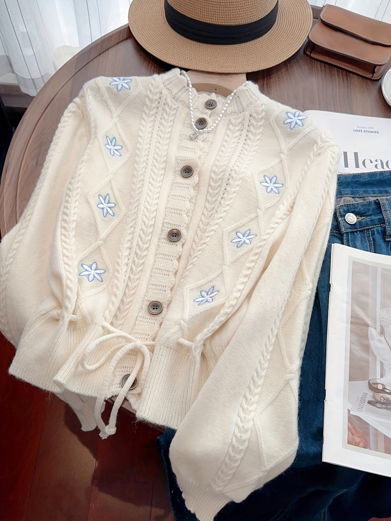 Women'S Elegant Beige Cardigan with Blue Floral Embroidery - Long Sleeve, Button-Up, Crew Neck, Lightweight & Breathable for Spring/Summer/Fall, Casual Wear, Spring Outerwear, Floral Embroidery Design, Soft Texture Fabric