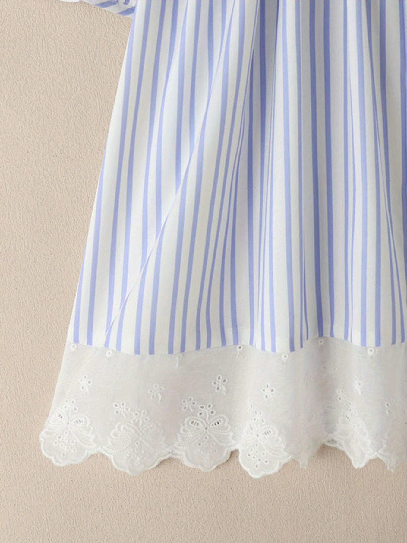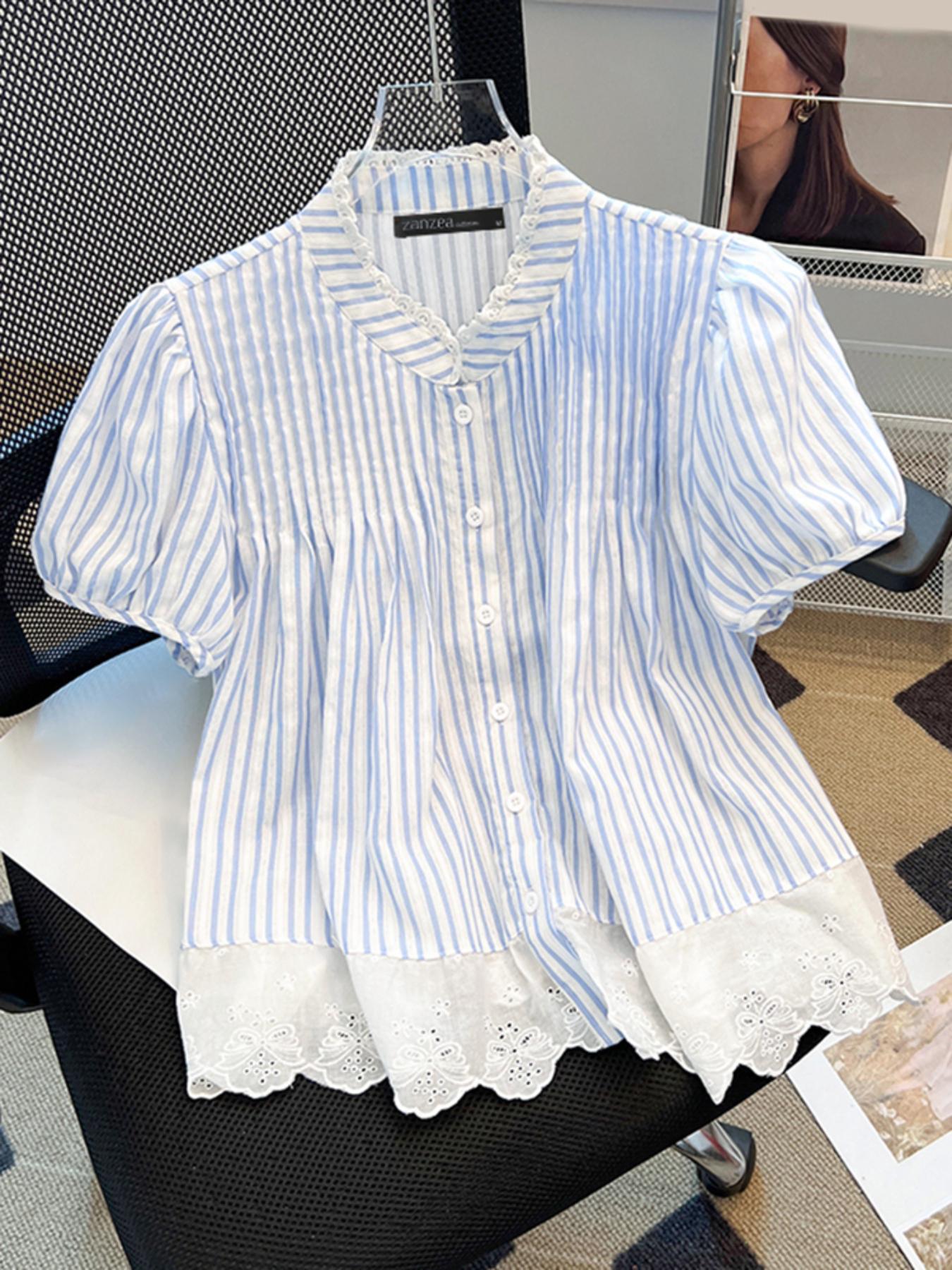 [ZANZEA Plus Size Blouse] Plus Size - ZANZEA Women's Plus Size Lightweight Elegant Blouse - Korean Style Striped & Lace Patchwork Stand Collar Puff Short Sleeve Single-Breasted Shirt, Breathable Summer Top for Office & Casual Outings, Versatile Clothing, Stylish Women